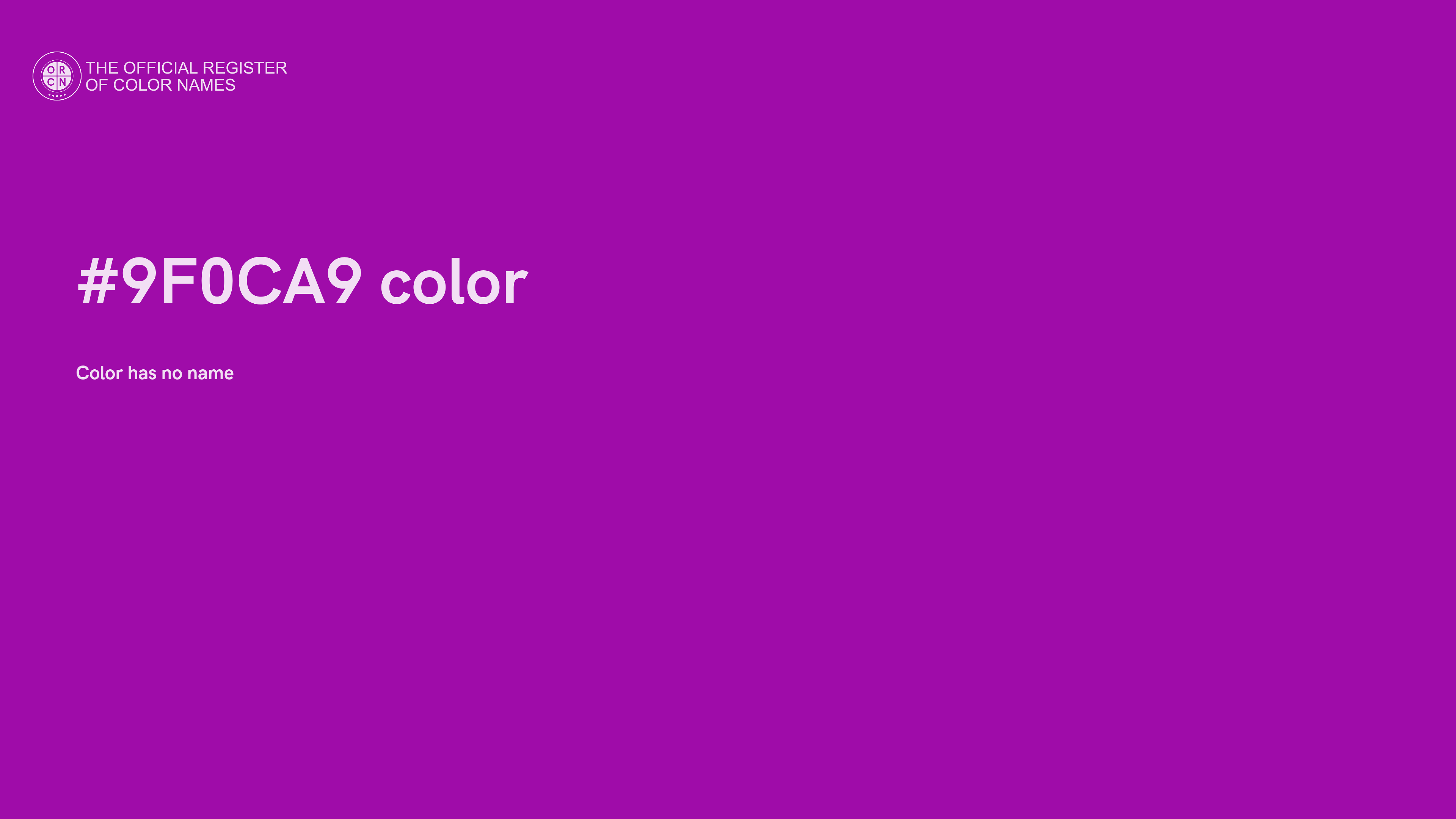 For printing in non digital world, #9F0CA9 is represented in CMYK as 4 Cyan, 62 Magenta, 0 Yellow, and 34 Black (Key) (C:4 M:62 Y:0 K:34).