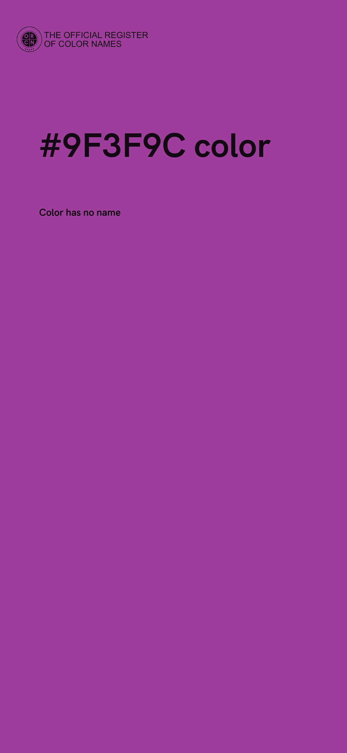 The digital color HEX #9F3F9C belongs to the Magenta Color Family featuring Moderate Saturation (Saturation Family) and Light (Brightness Family).