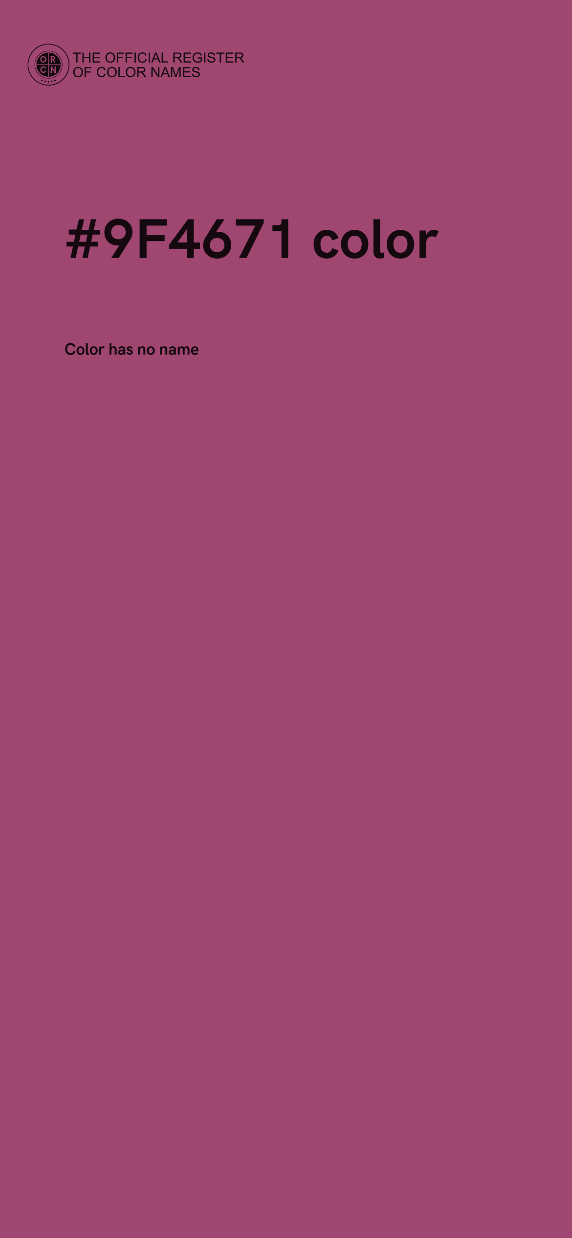 The digital color HEX #9F4671 belongs to the Rose Color Family featuring Mild Saturation (Saturation Family) and Light (Brightness Family).