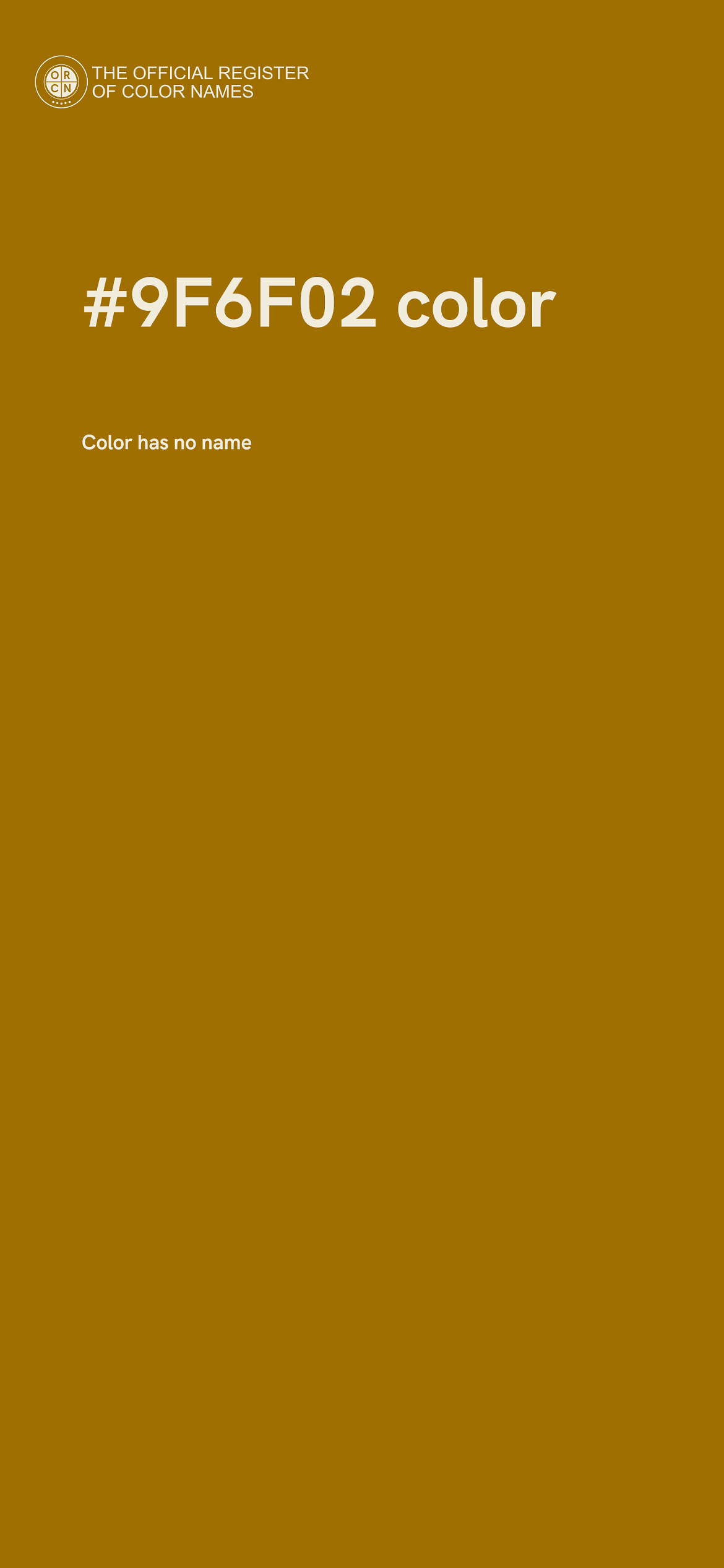 The digital color HEX #9F6F02 belongs to the Orange Color Family featuring Full Saturation (Saturation Family) and Neutral (Brightness Family).