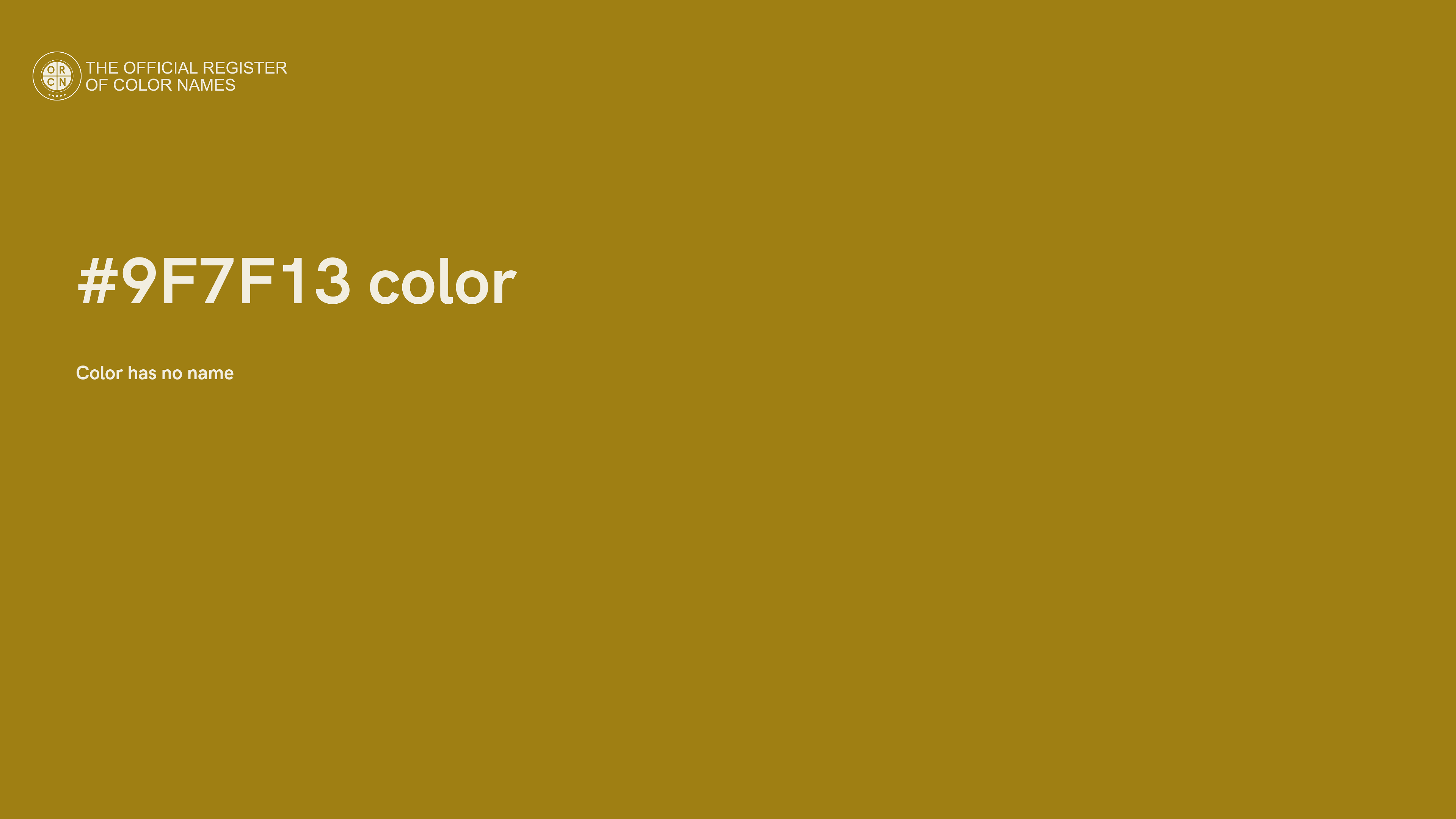 The digital color HEX #9F7F13 belongs to the Yellow Color Family featuring High Saturation (Saturation Family) and Neutral (Brightness Family).