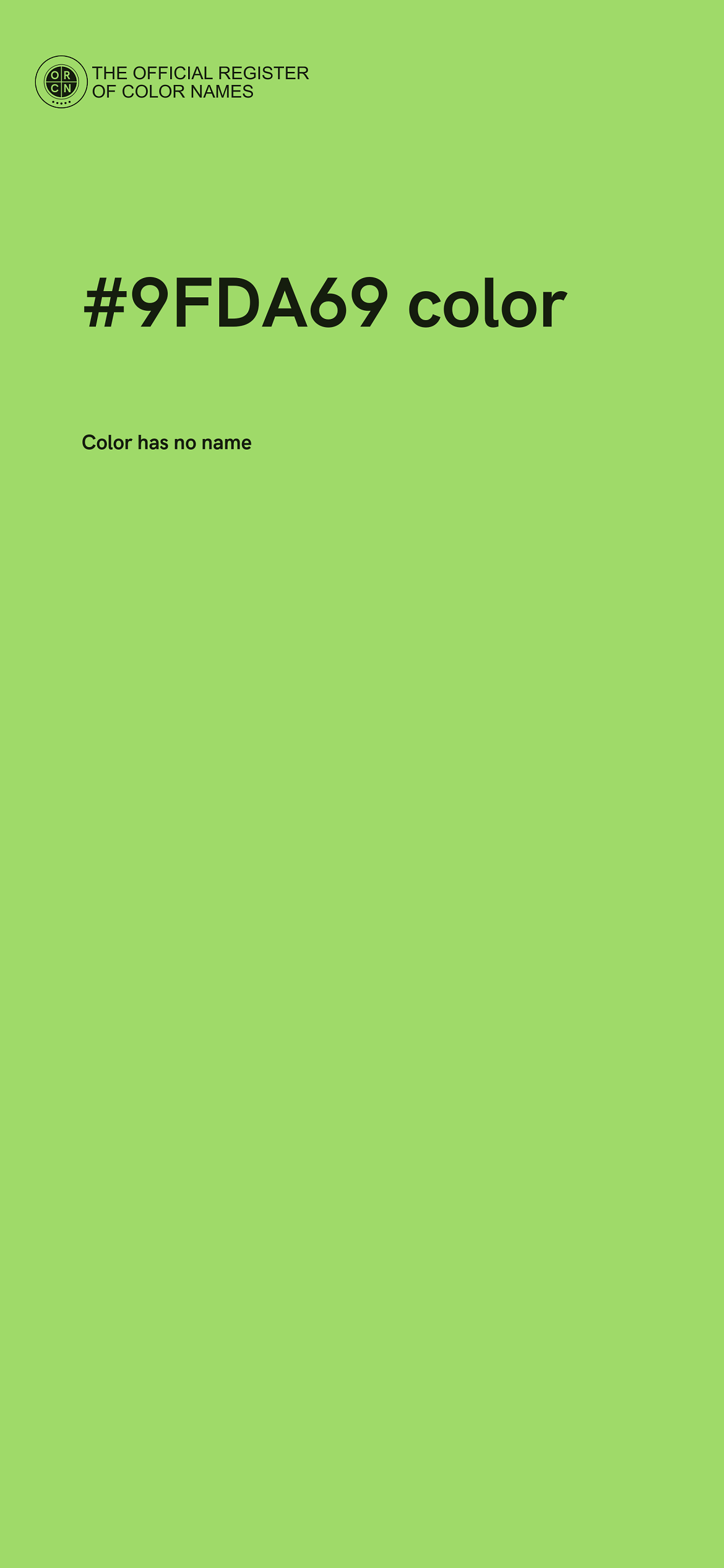 For printing in non digital world, #9FDA69 is represented in CMYK as 23 Cyan, 0 Magenta, 44 Yellow, and 15 Black (Key) (C:23 M:0 Y:44 K:15).