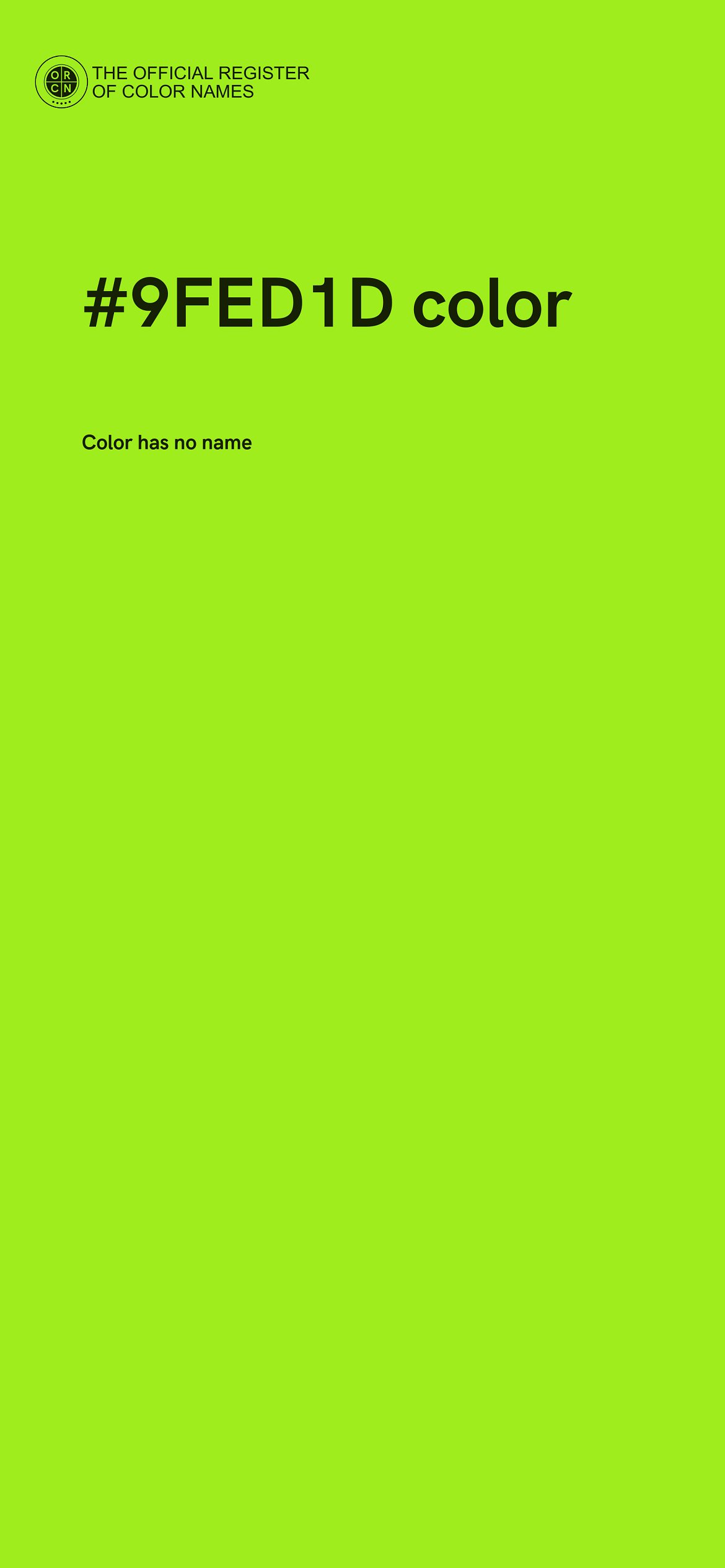 The digital color HEX #9FED1D belongs to the Chartreuse Color Family featuring Full Saturation (Saturation Family) and Light (Brightness Family).