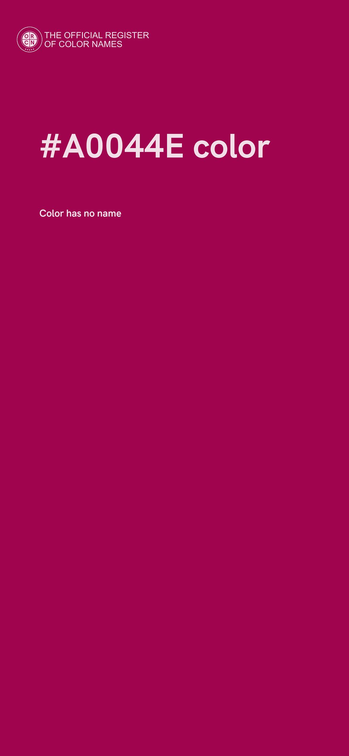 The digital color HEX #A0044E belongs to the Rose Color Family featuring Full Saturation (Saturation Family) and Neutral (Brightness Family).