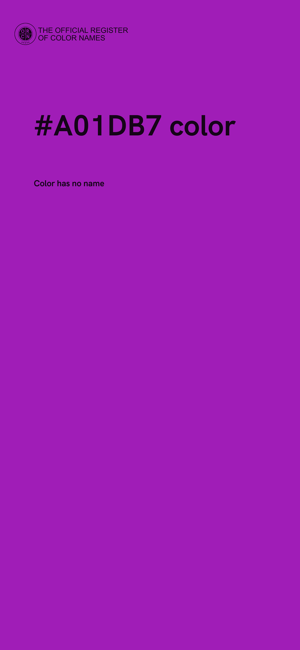 The digital color HEX #A01DB7 belongs to the Magenta Color Family featuring High Saturation (Saturation Family) and Light (Brightness Family).