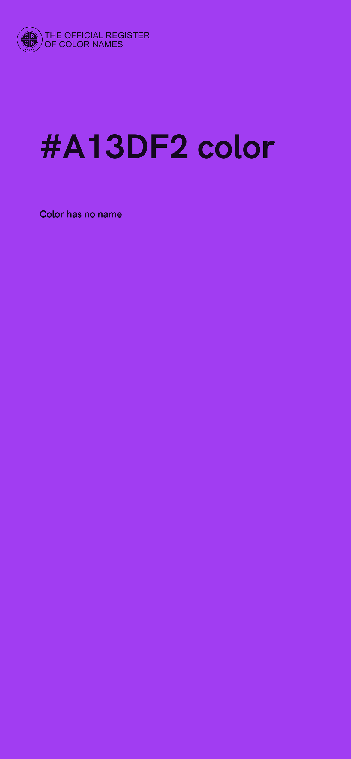 The digital color HEX #A13DF2 belongs to the Violet Color Family featuring Full Saturation (Saturation Family) and Light (Brightness Family).