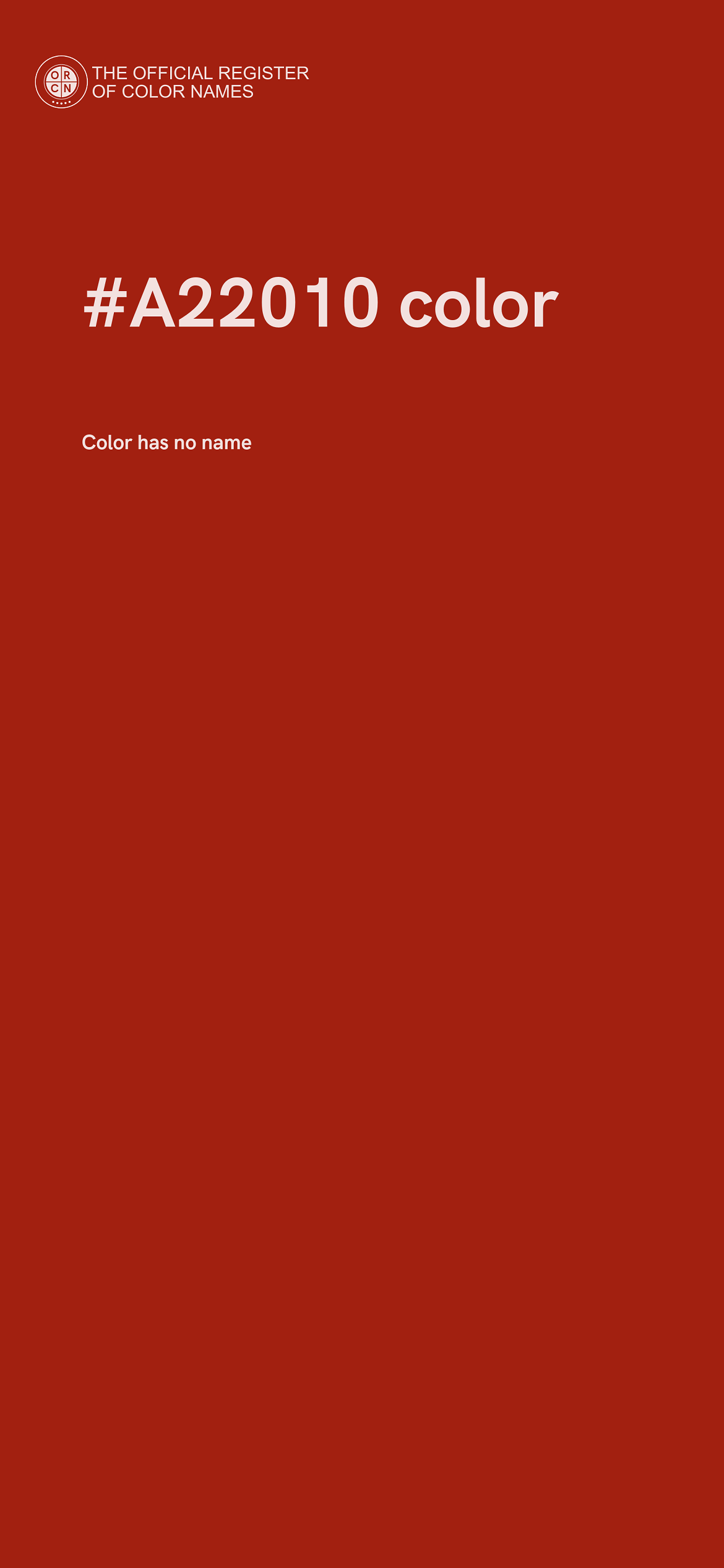 The digital color HEX #A22010 belongs to the Red Color Family featuring High Saturation (Saturation Family) and Neutral (Brightness Family).