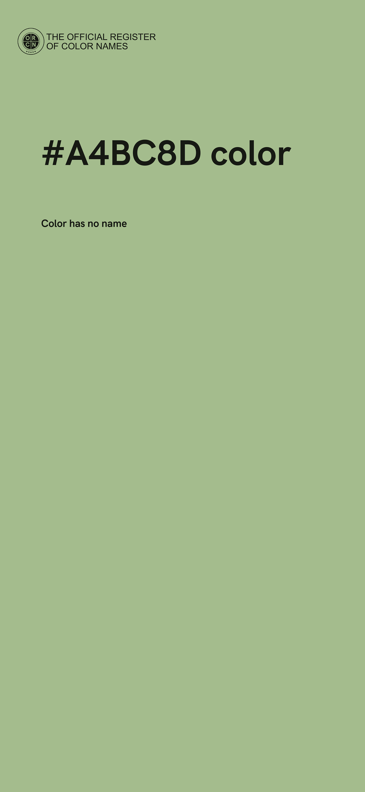 For printing in non digital world, #A4BC8D is represented in CMYK as 9 Cyan, 0 Magenta, 18 Yellow, and 26 Black (Key) (C:9 M:0 Y:18 K:26).