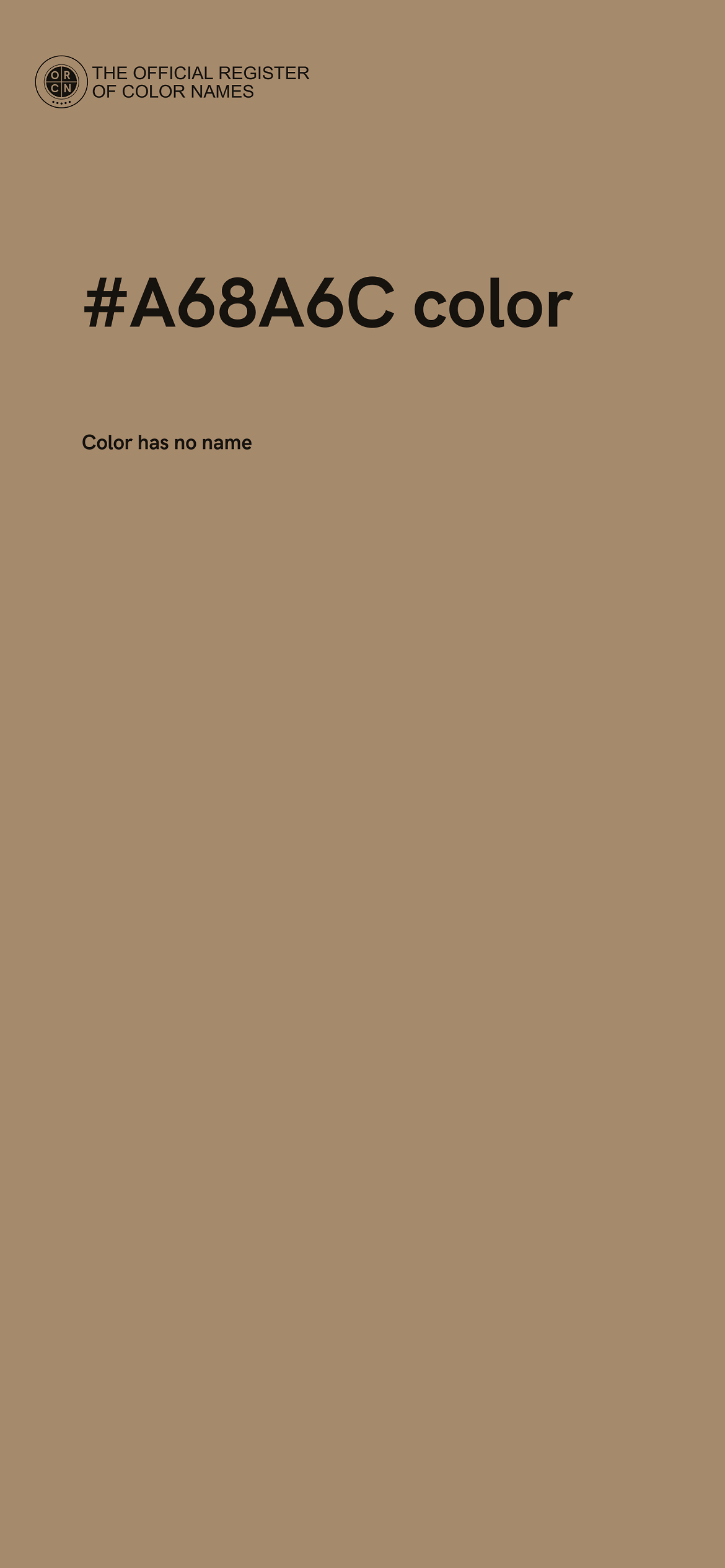 The digital color HEX #A68A6C belongs to the Orange Color Family featuring Mild Saturation (Saturation Family) and Light (Brightness Family).