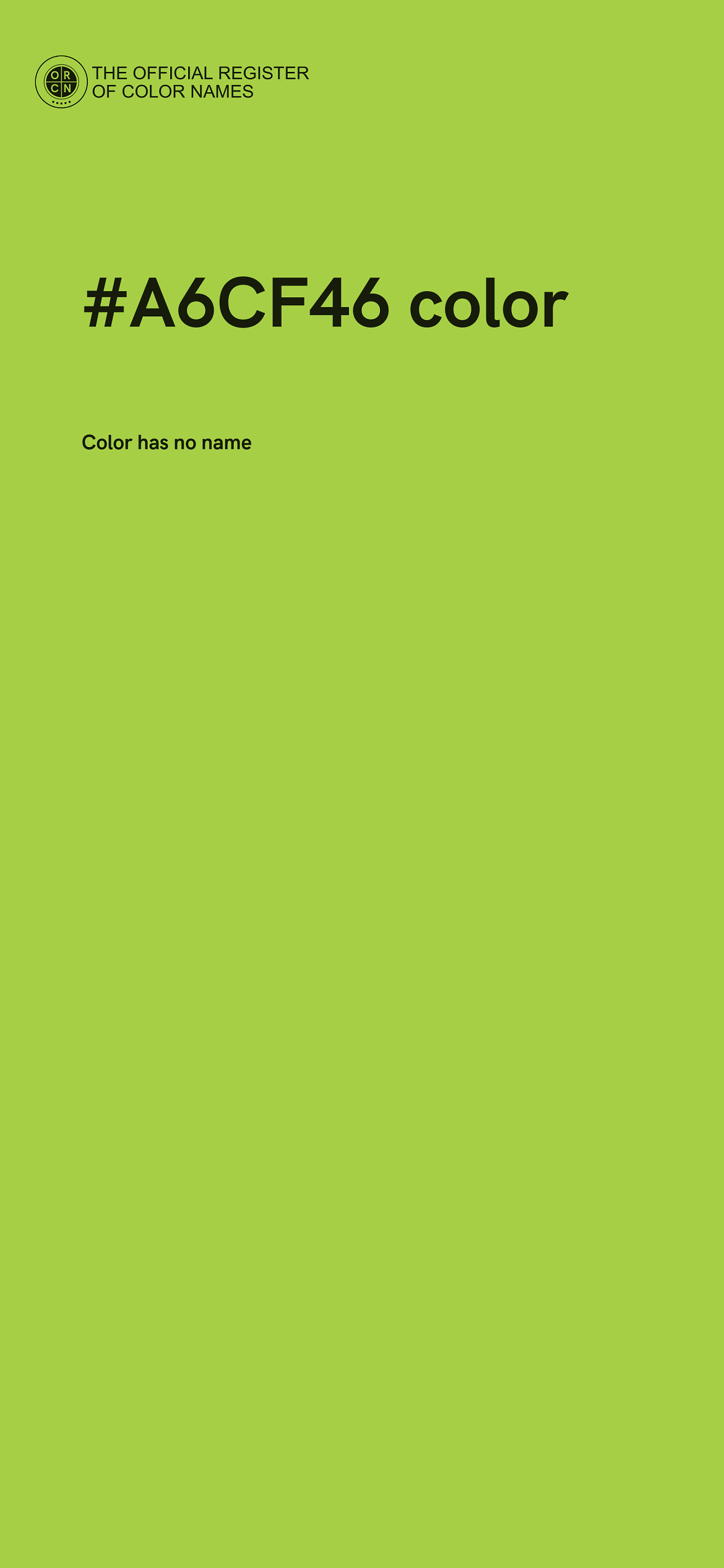The digital color HEX #A6CF46 belongs to the Chartreuse Color Family featuring Moderate Saturation (Saturation Family) and Light (Brightness Family).