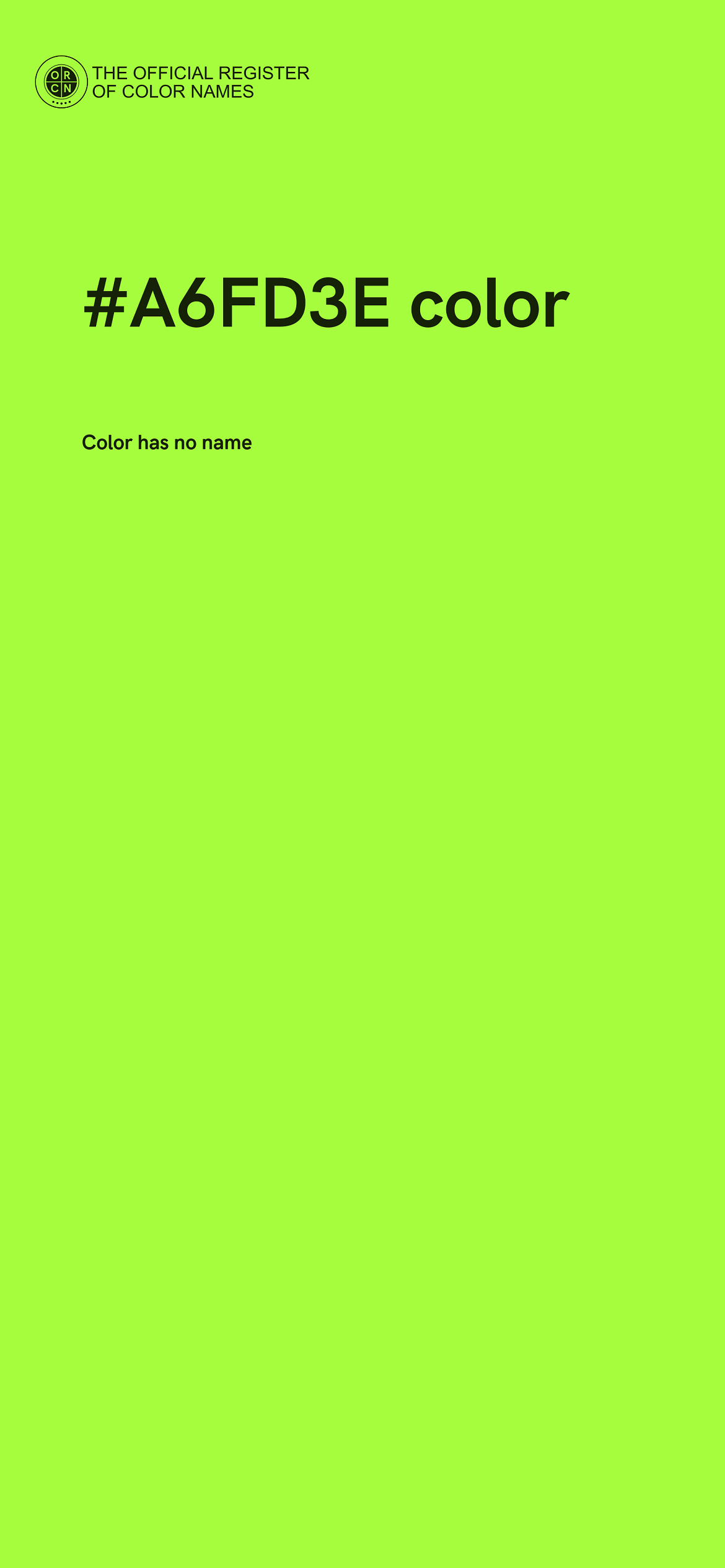 The digital color HEX #A6FD3E belongs to the Chartreuse Color Family featuring Full Saturation (Saturation Family) and Very Light (Brightness Family).