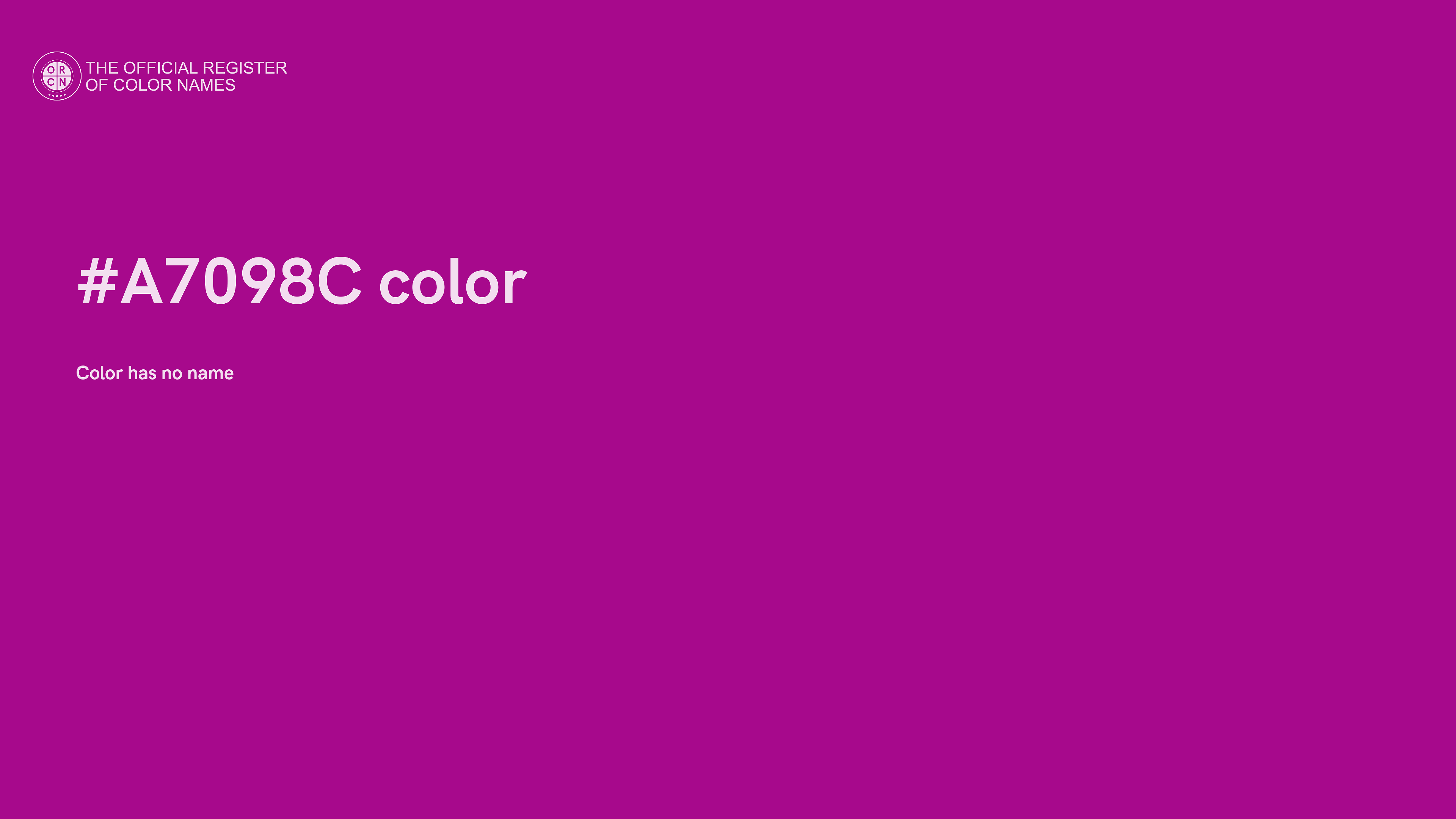 The digital color HEX #A7098C belongs to the Magenta Color Family featuring Full Saturation (Saturation Family) and Neutral (Brightness Family).