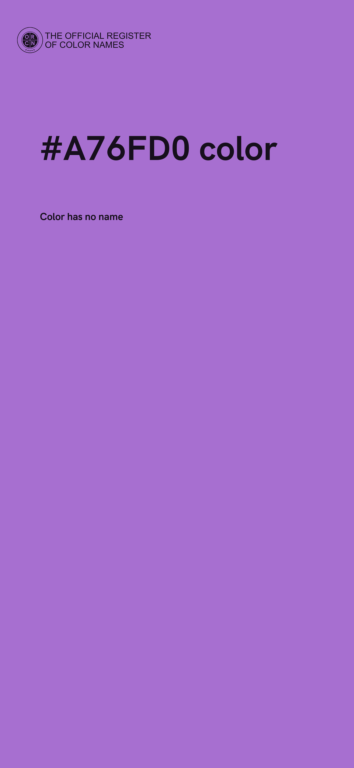 The digital color HEX #A76FD0 belongs to the Violet Color Family featuring Moderate Saturation (Saturation Family) and Very Light (Brightness Family).