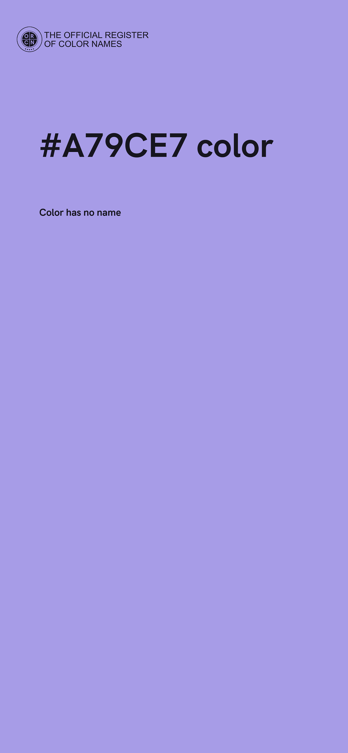 The digital color HEX #A79CE7 belongs to the Blue Color Family featuring High Saturation (Saturation Family) and Very Light (Brightness Family).