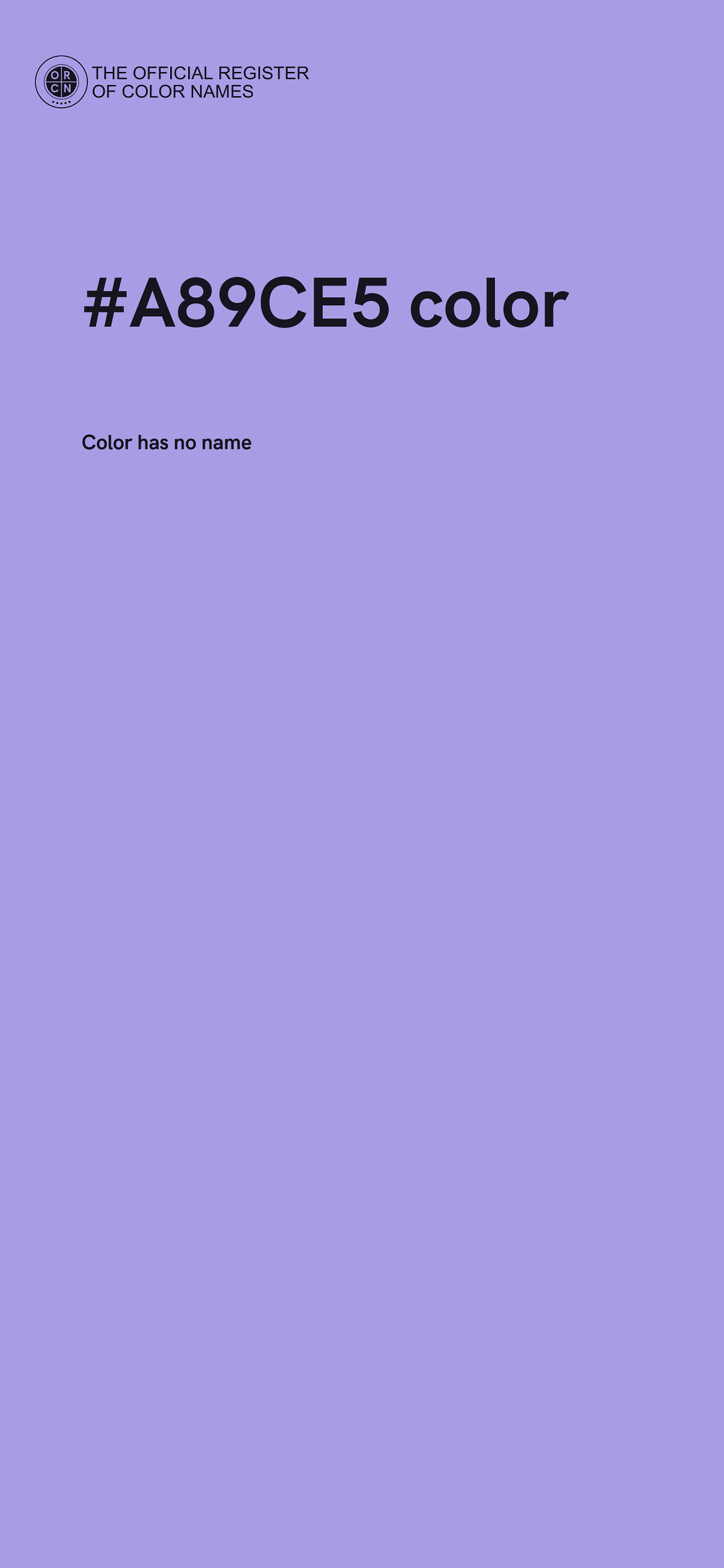 The digital color HEX #A89CE5 belongs to the Blue Color Family featuring Moderate Saturation (Saturation Family) and Very Light (Brightness Family).