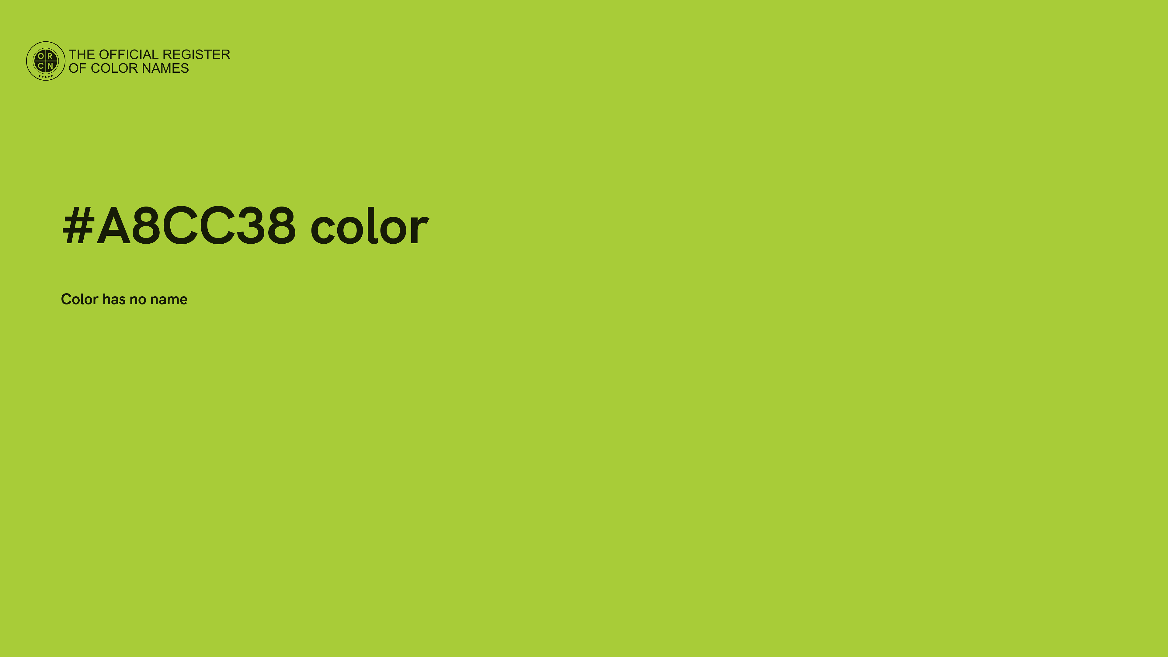 The digital color HEX #A8CC38 belongs to the Chartreuse Color Family featuring Moderate Saturation (Saturation Family) and Light (Brightness Family).