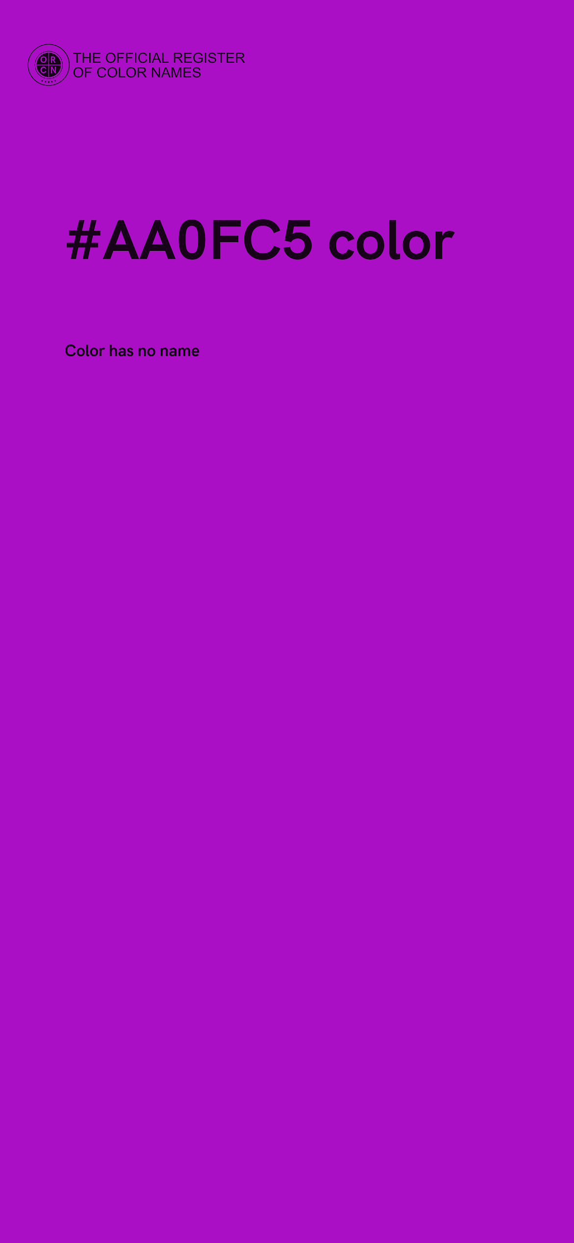 For printing in non digital world, #AA0FC5 is represented in CMYK as 11 Cyan, 71 Magenta, 0 Yellow, and 23 Black (Key) (C:11 M:71 Y:0 K:23).