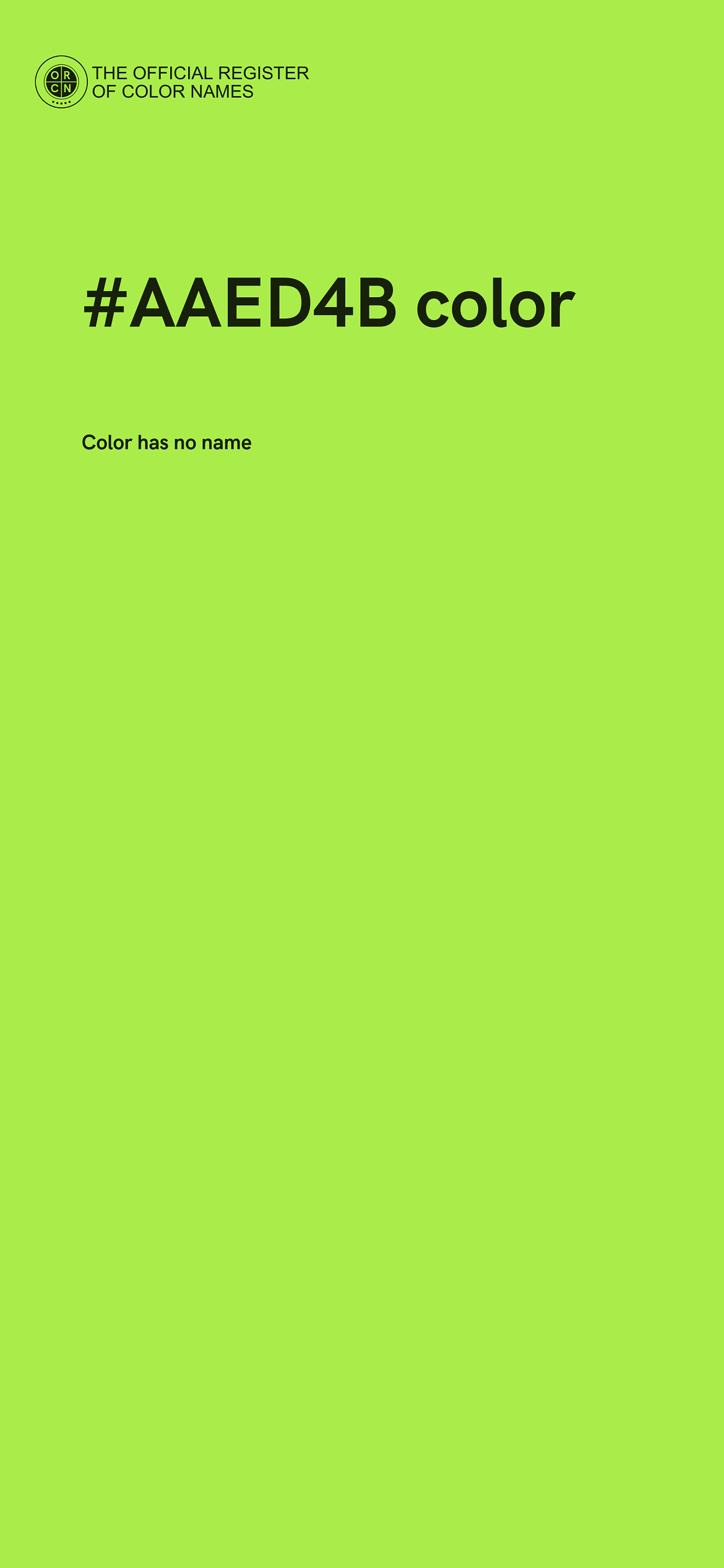 The digital color HEX #AAED4B belongs to the Chartreuse Color Family featuring High Saturation (Saturation Family) and Very Light (Brightness Family).