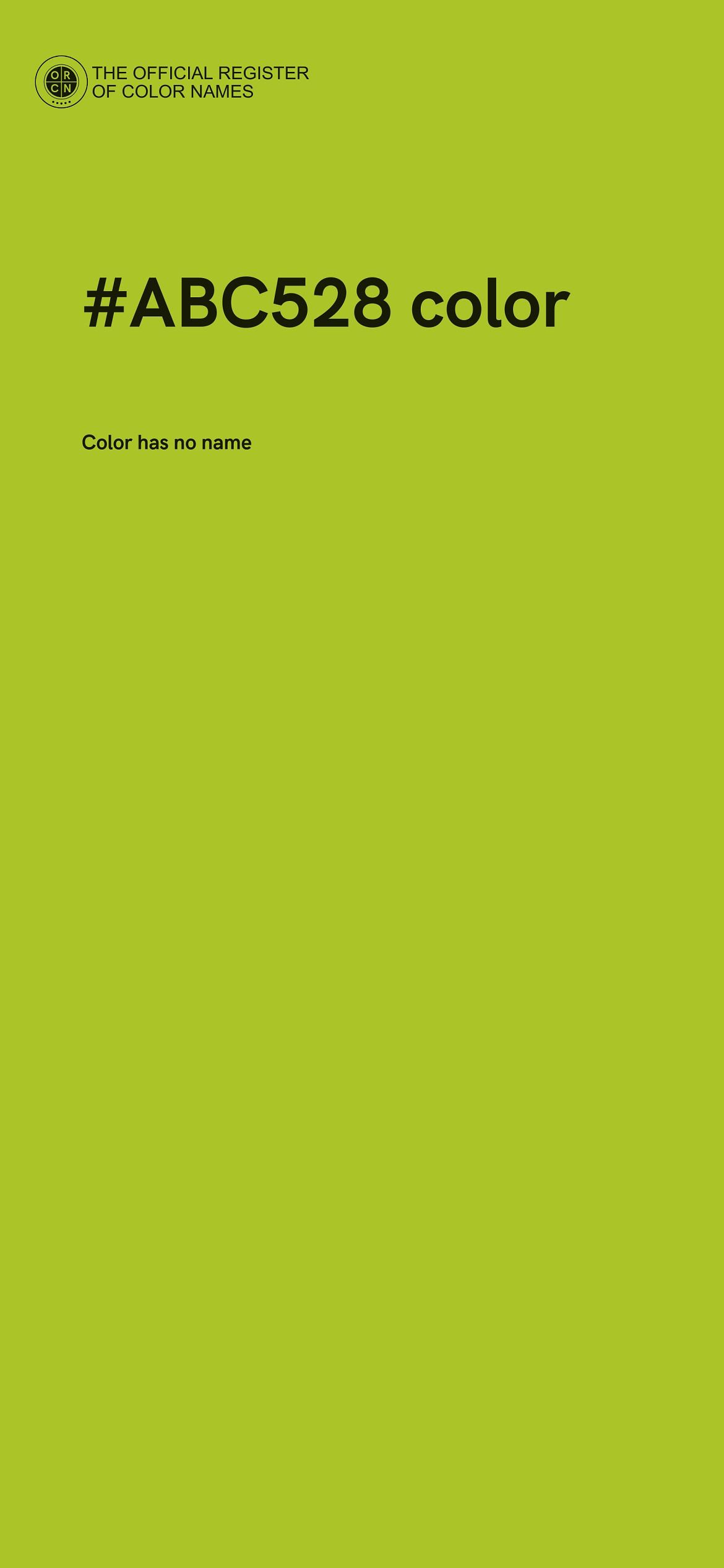 For printing in non digital world, #ABC528 is represented in CMYK as 10 Cyan, 0 Magenta, 62 Yellow, and 23 Black (Key) (C:10 M:0 Y:62 K:23).