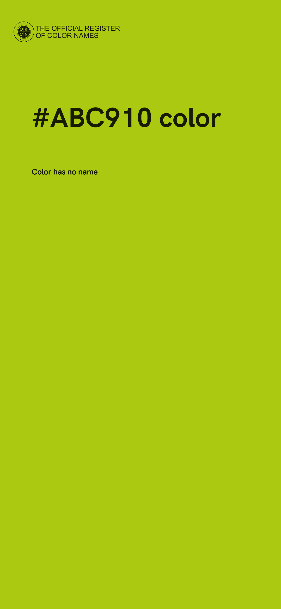 For printing in non digital world, #ABC910 is represented in CMYK as 12 Cyan, 0 Magenta, 73 Yellow, and 21 Black (Key) (C:12 M:0 Y:73 K:21).