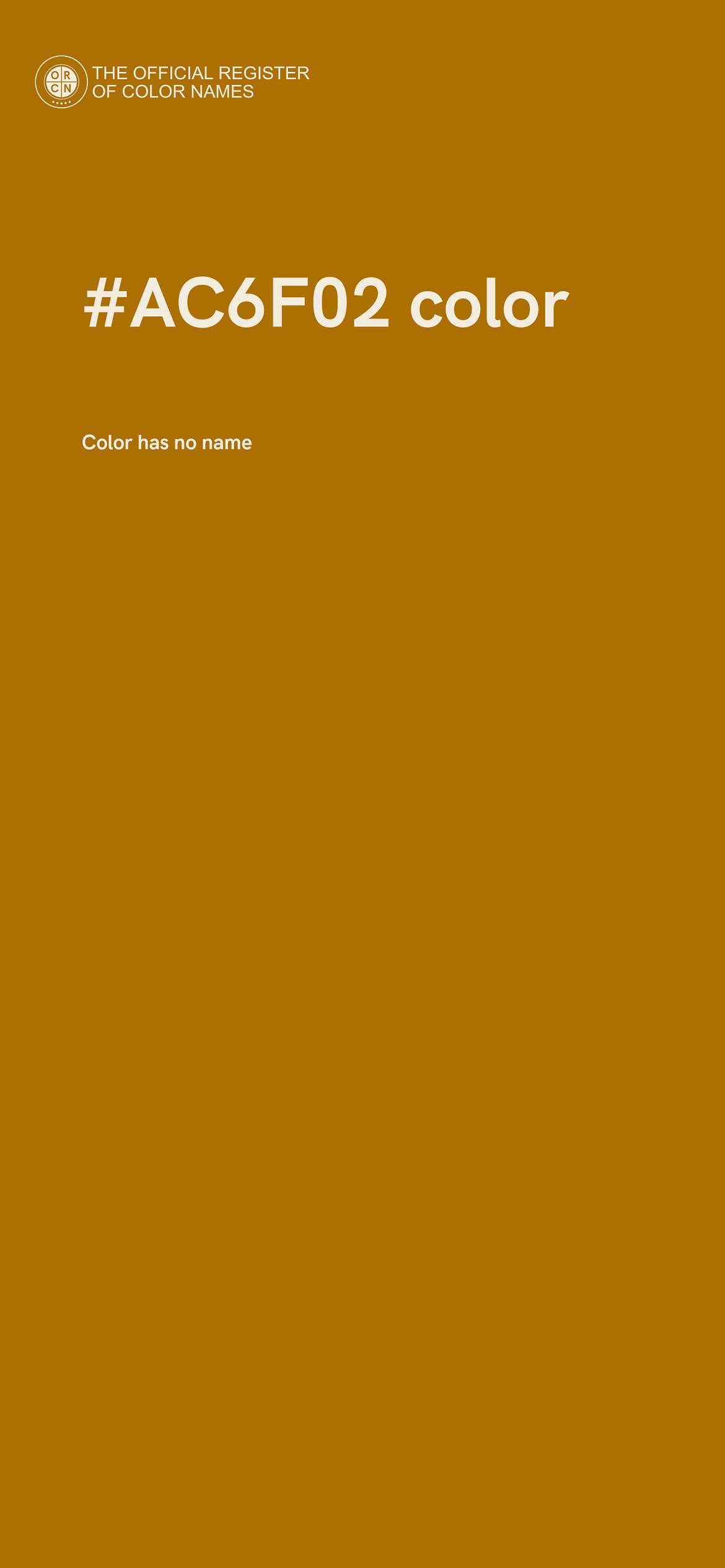 The digital color HEX #AC6F02 belongs to the Orange Color Family featuring Full Saturation (Saturation Family) and Neutral (Brightness Family).