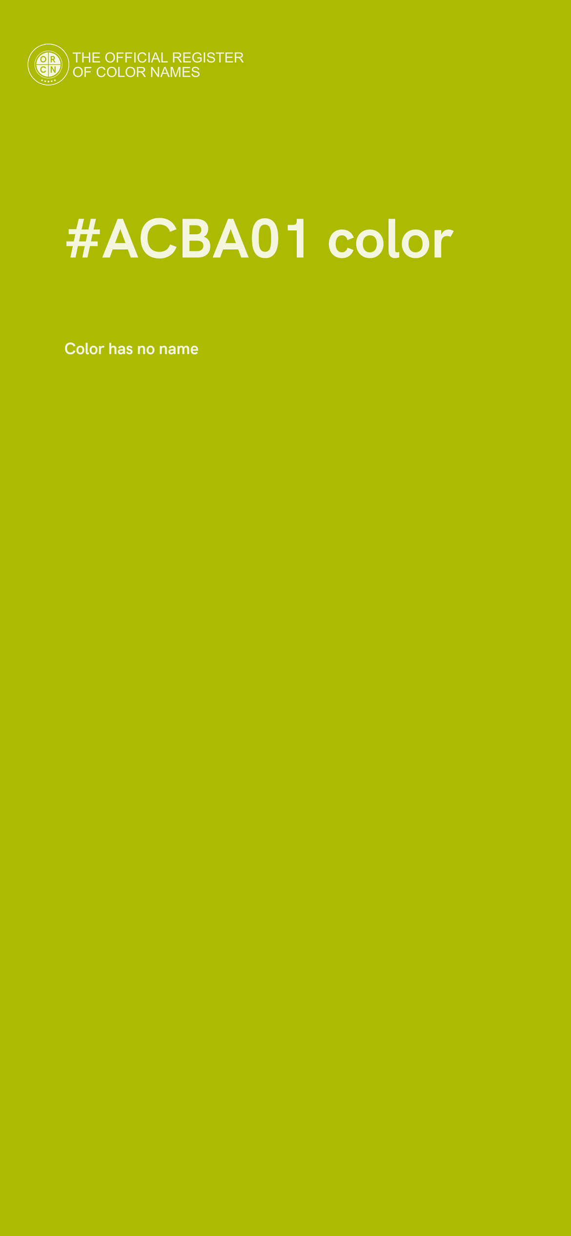 The digital color HEX #ACBA01 belongs to the Yellow Color Family featuring Full Saturation (Saturation Family) and Neutral (Brightness Family).