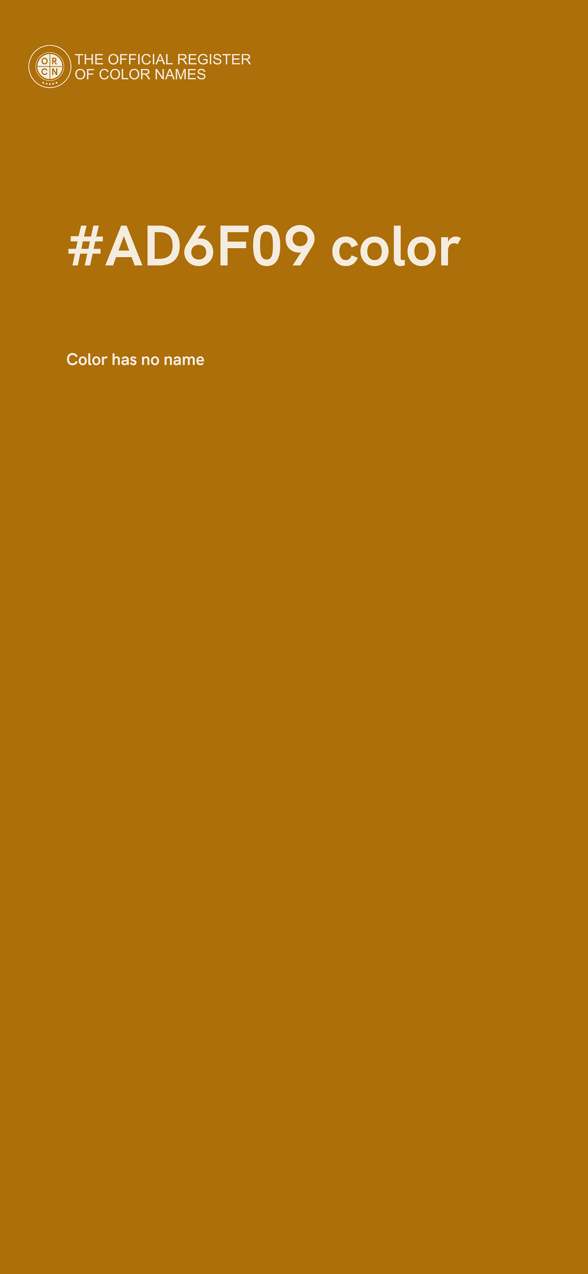 The digital color HEX #AD6F09 belongs to the Orange Color Family featuring Full Saturation (Saturation Family) and Neutral (Brightness Family).