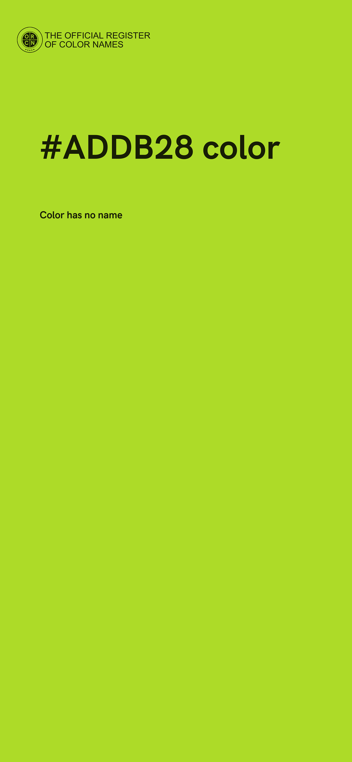 For printing in non digital world, #ADDB28 is represented in CMYK as 18 Cyan, 0 Magenta, 70 Yellow, and 14 Black (Key) (C:18 M:0 Y:70 K:14).