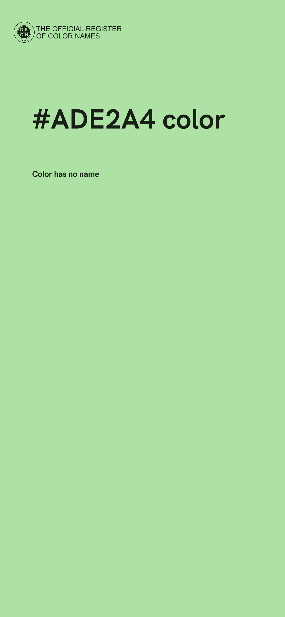 The digital color HEX #ADE2A4 belongs to the Green Color Family featuring Moderate Saturation (Saturation Family) and Very Light (Brightness Family).
