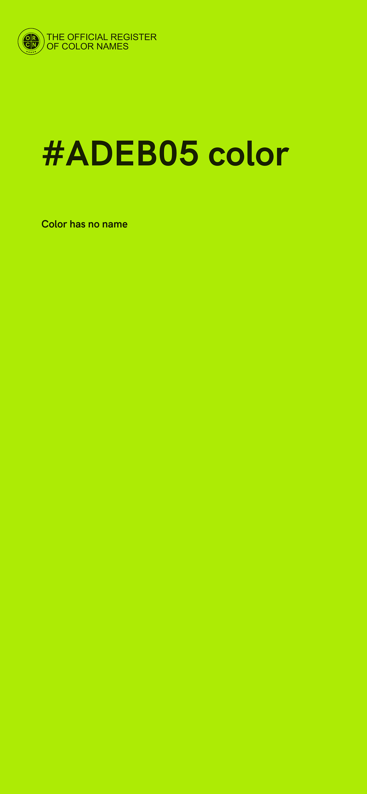 The digital color HEX #ADEB05 belongs to the Chartreuse Color Family featuring Full Saturation (Saturation Family) and Light (Brightness Family).