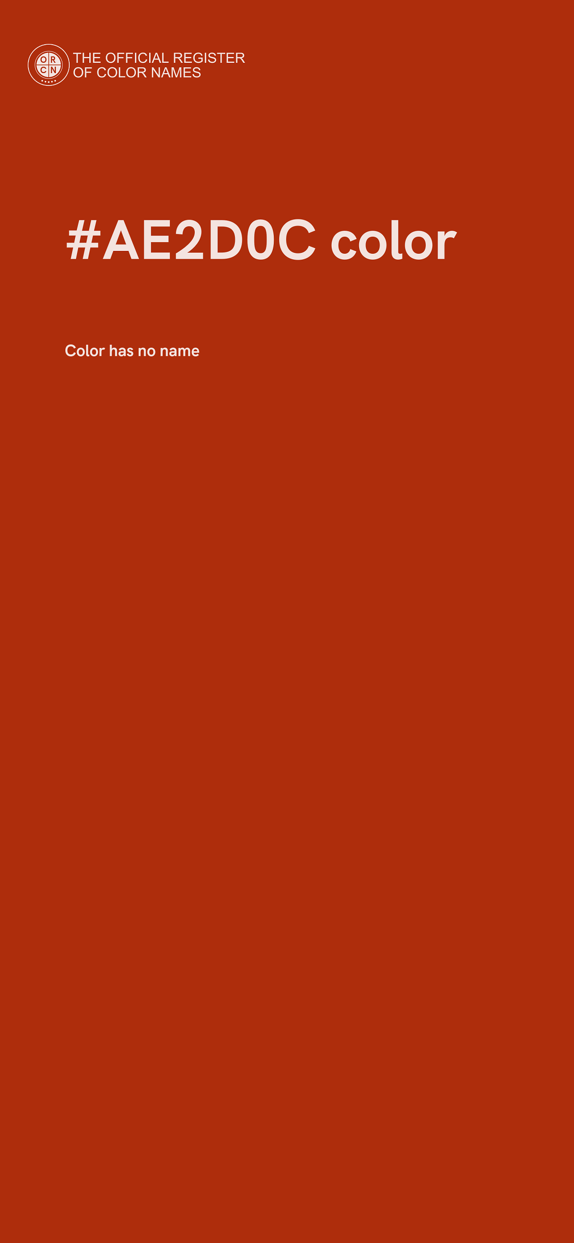 The digital color HEX #AE2D0C belongs to the Red Color Family featuring Full Saturation (Saturation Family) and Neutral (Brightness Family).
