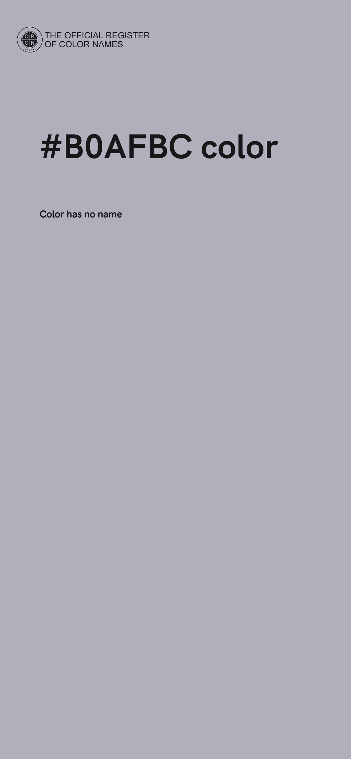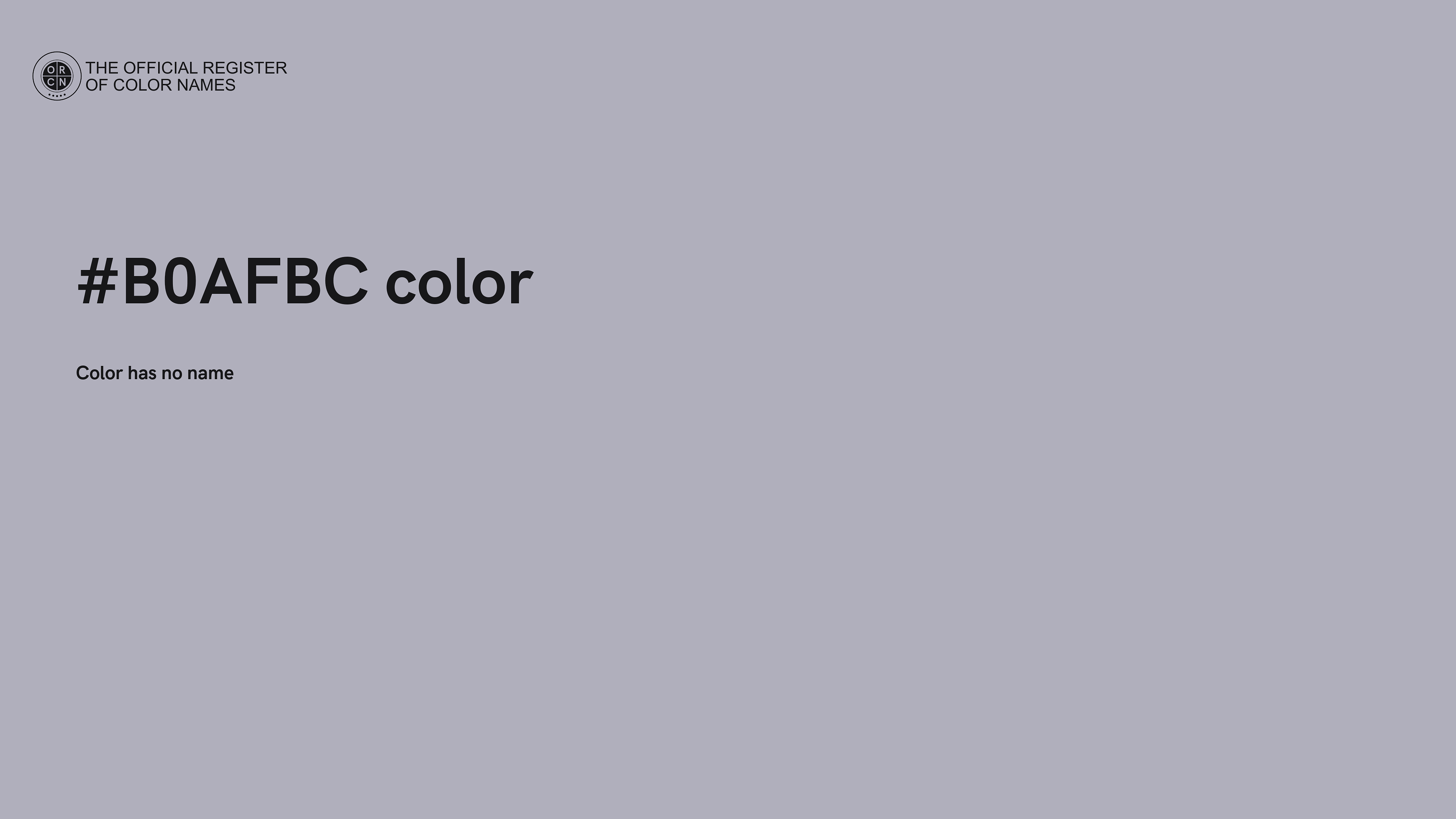 The digital color HEX #B0AFBC belongs to the Blue Color Family featuring Desaturated (Saturation Family) and Very Light (Brightness Family).