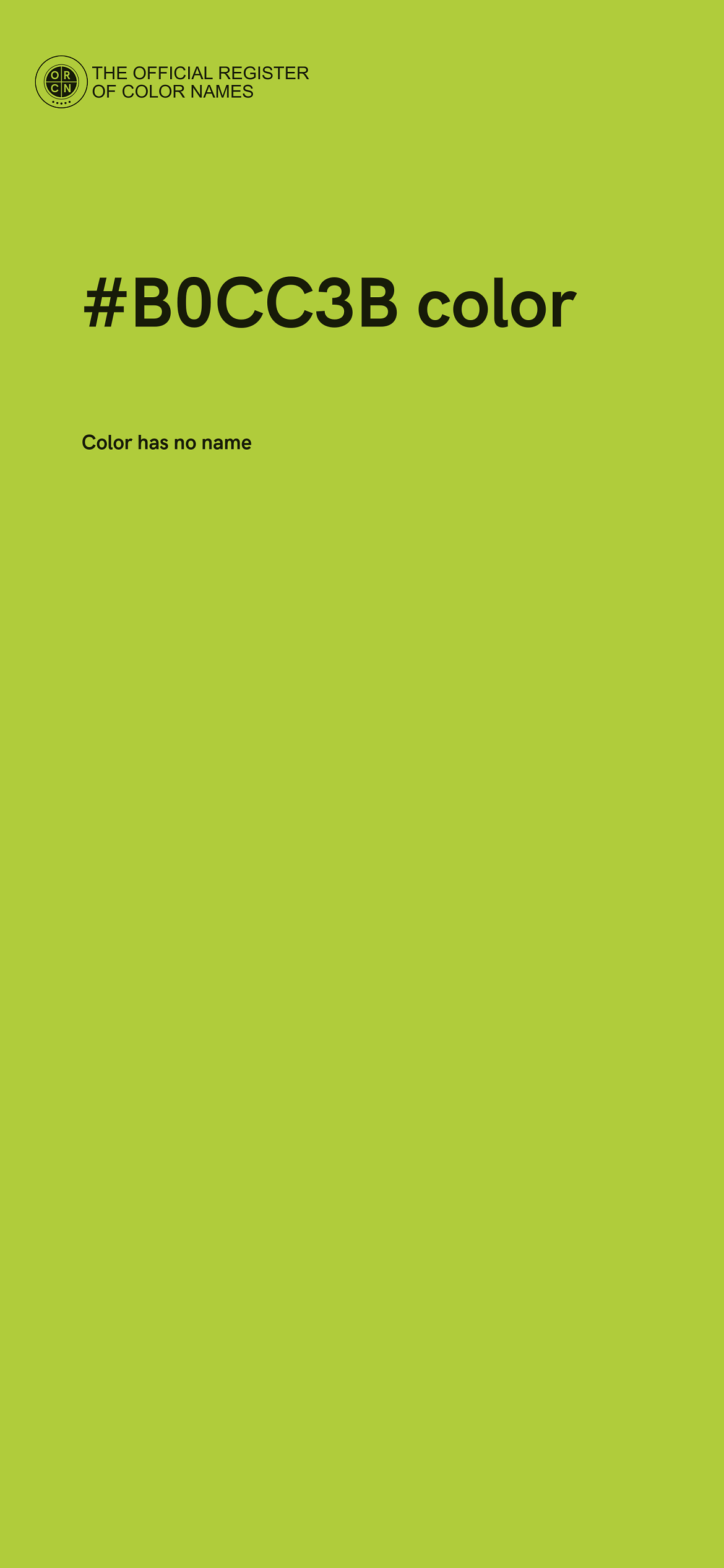 The digital color HEX #B0CC3B belongs to the Yellow Color Family featuring Moderate Saturation (Saturation Family) and Light (Brightness Family).