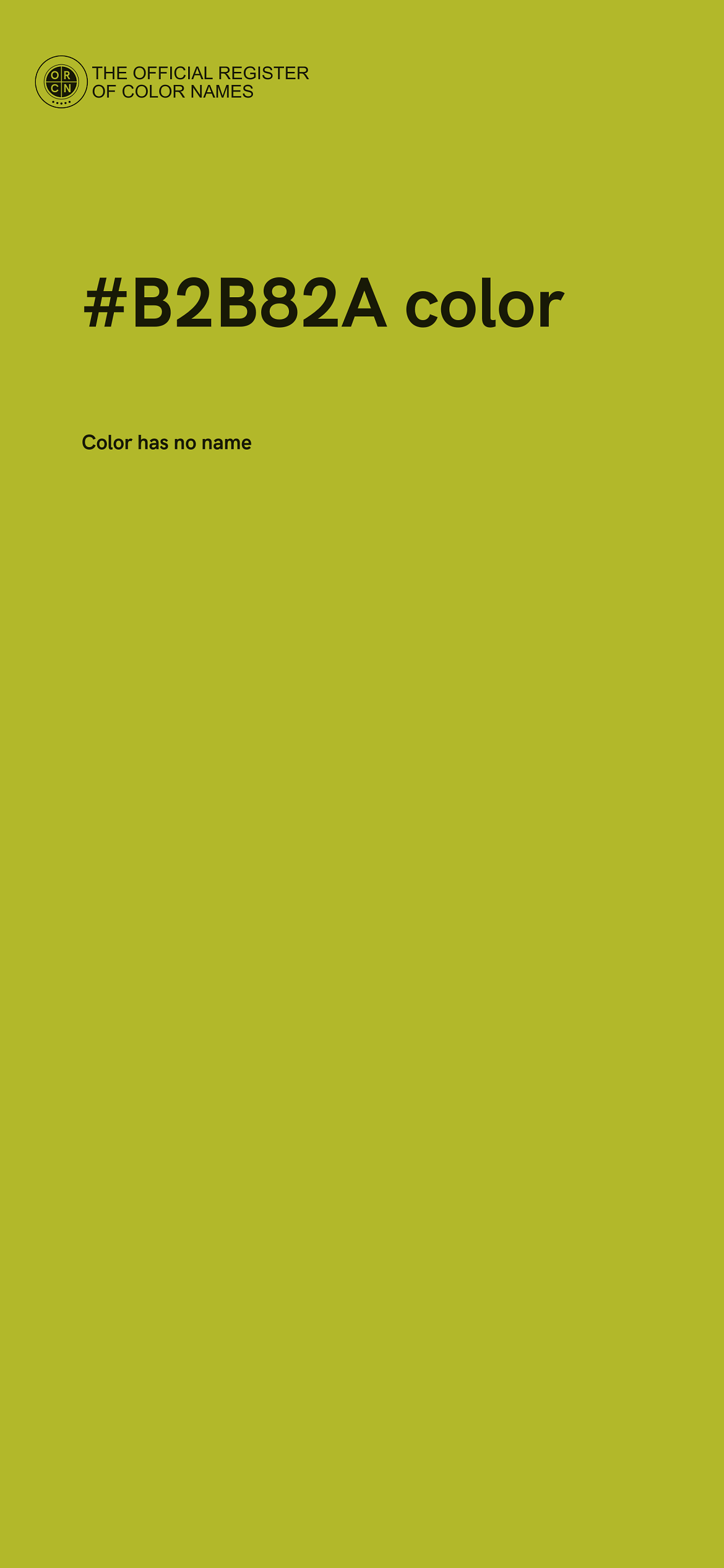 For printing in non digital world, #B2B82A is represented in CMYK as 2 Cyan, 0 Magenta, 56 Yellow, and 28 Black (Key) (C:2 M:0 Y:56 K:28).