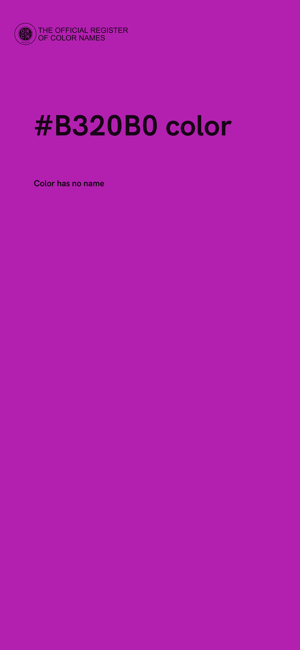 The digital color HEX #B320B0 belongs to the Magenta Color Family featuring High Saturation (Saturation Family) and Light (Brightness Family).