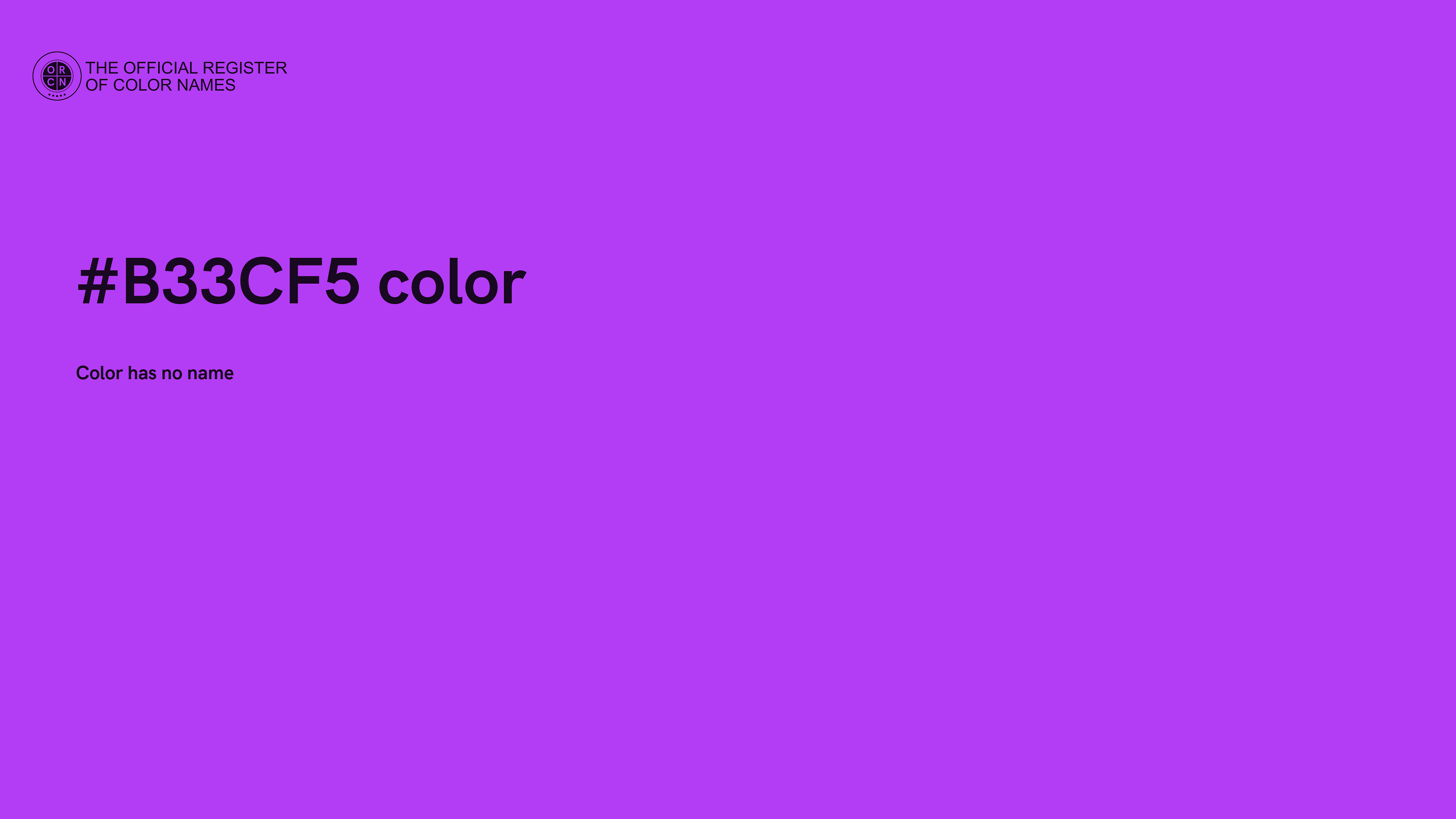 HEX code #B33CF5 represent the color in hexadecimal format by combining three values – the amounts of Red, Green and Blue (RGB). Its RGB composition is 179, 60, 245 ( rgb(179, 60, 245) ), which breaks down into 70.2% of Red, 23.5% Green and 96.1% Blue.