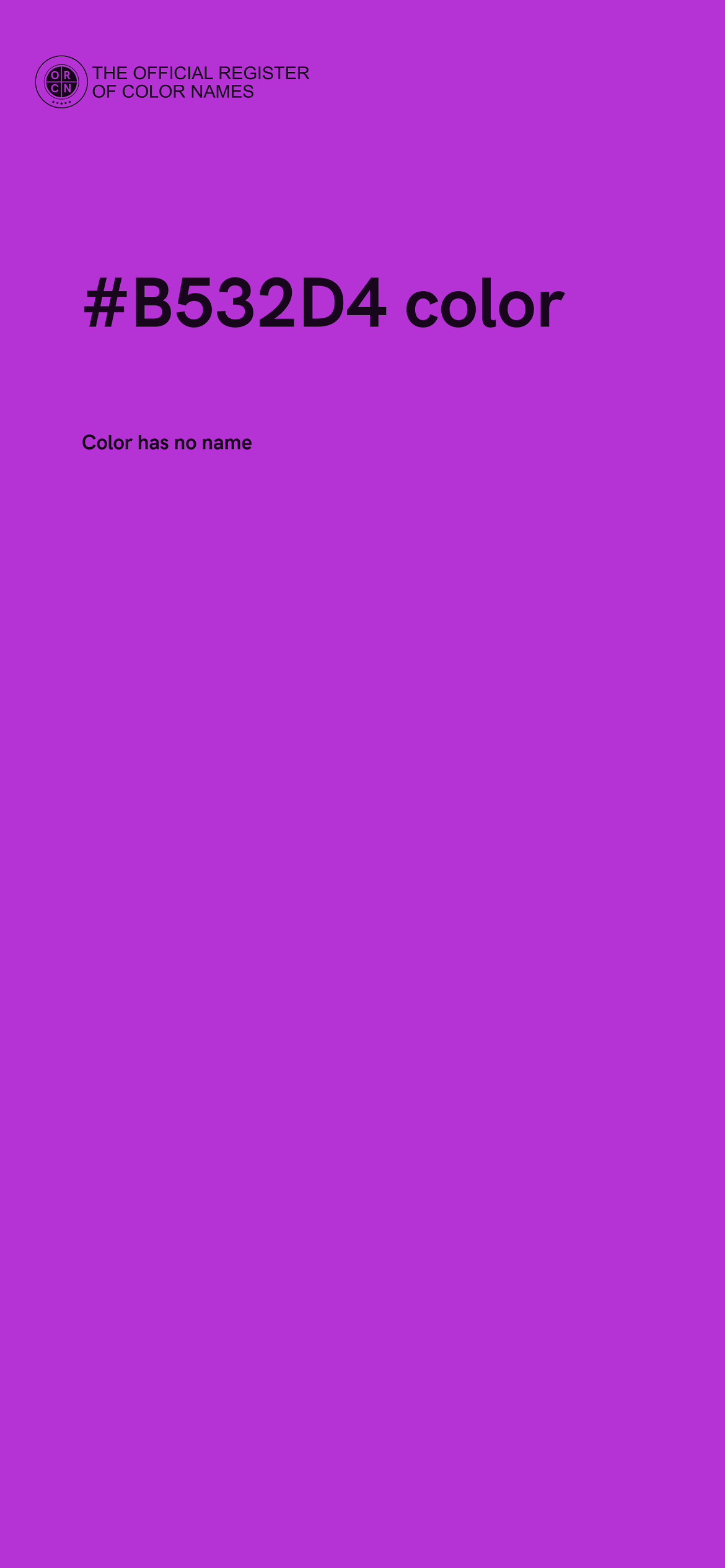 The digital color HEX #B532D4 belongs to the Magenta Color Family featuring High Saturation (Saturation Family) and Light (Brightness Family).