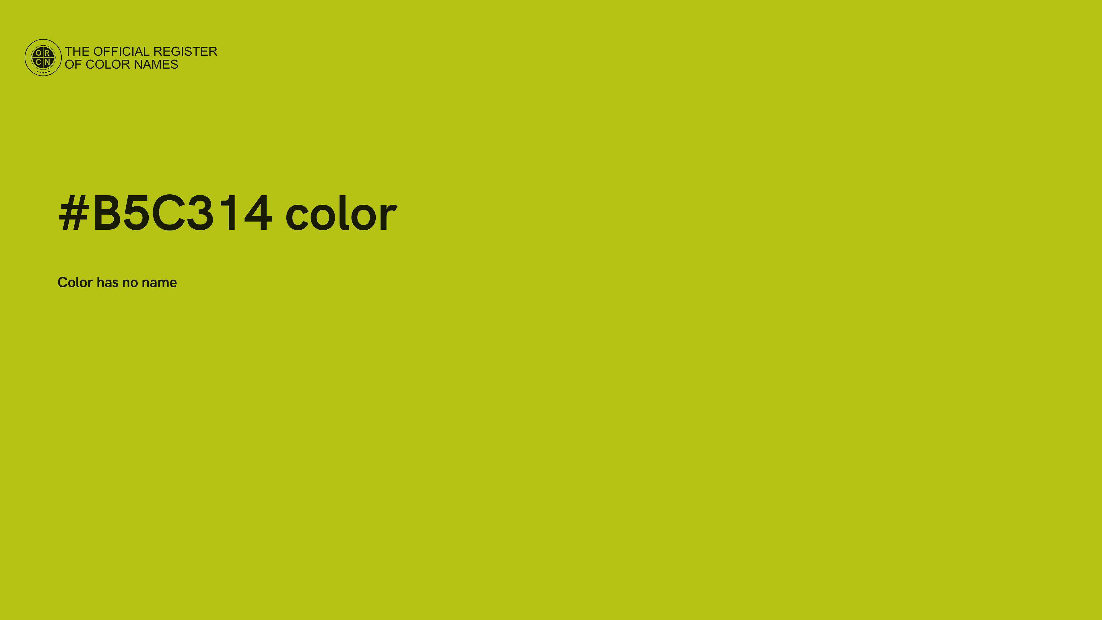 The digital color HEX #B5C314 belongs to the Yellow Color Family featuring High Saturation (Saturation Family) and Light (Brightness Family).
