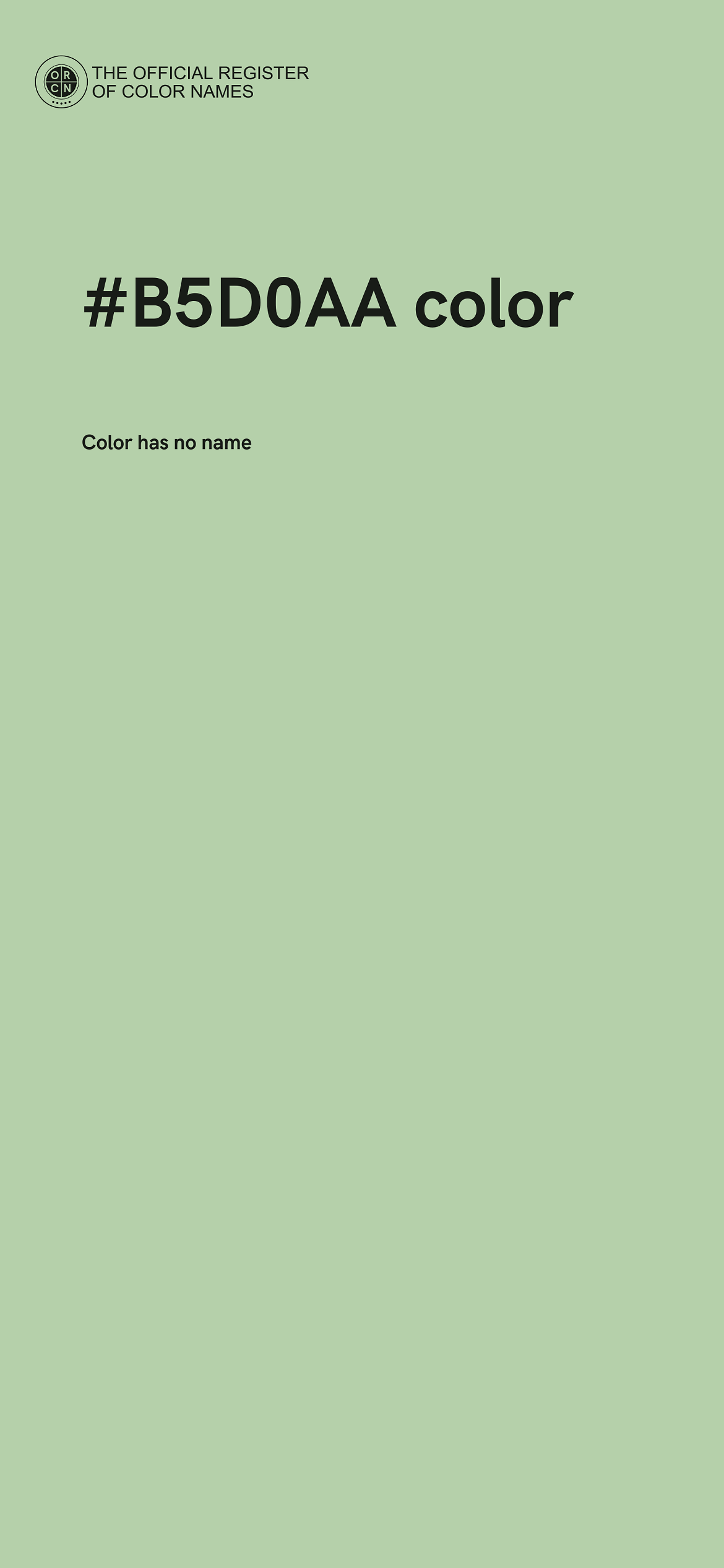 For printing in non digital world, #B5D0AA is represented in CMYK as 11 Cyan, 0 Magenta, 15 Yellow, and 18 Black (Key) (C:11 M:0 Y:15 K:18).