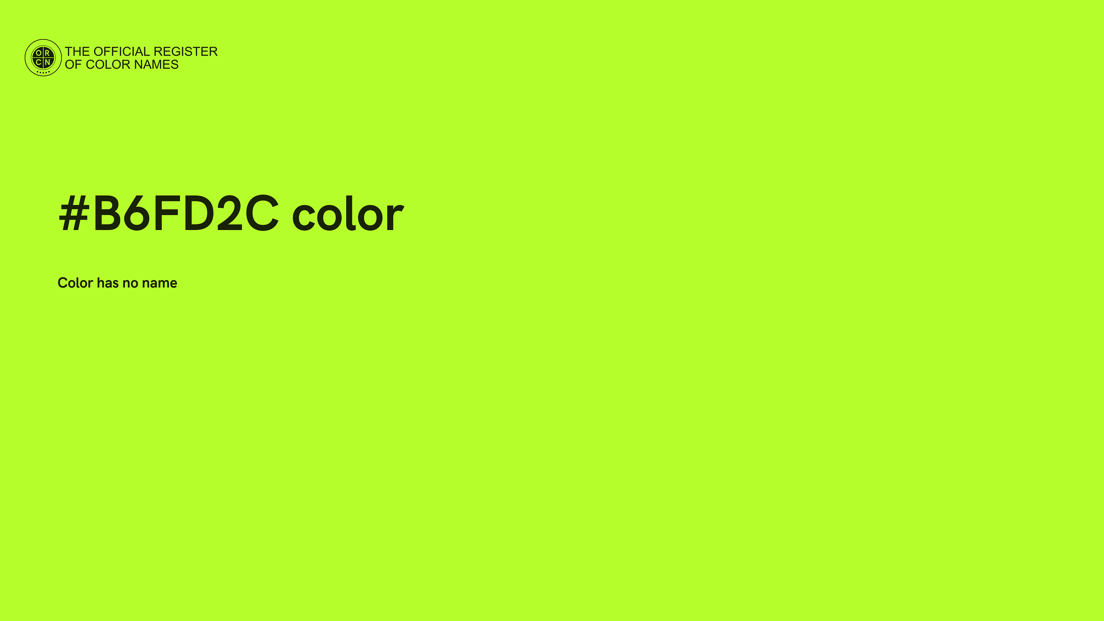 HEX code #B6FD2C represent the color in hexadecimal format by combining three values – the amounts of Red, Green and Blue (RGB). Its RGB composition is 182, 253, 44 ( rgb(182, 253, 44) ), which breaks down into 71.4% of Red, 99.2% Green and 17.3% Blue.