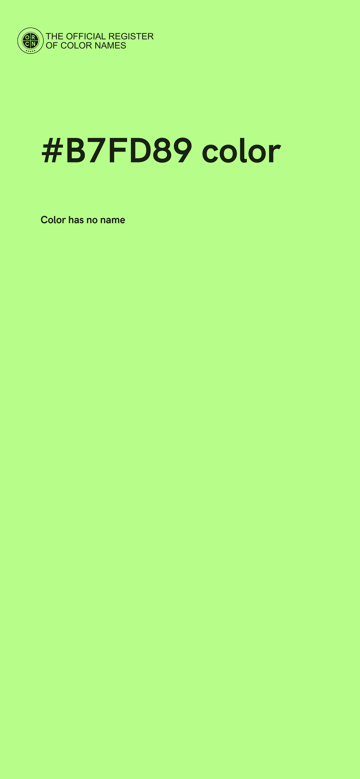 The digital color HEX #B7FD89 belongs to the Chartreuse Color Family featuring Full Saturation (Saturation Family) and Very Light (Brightness Family).