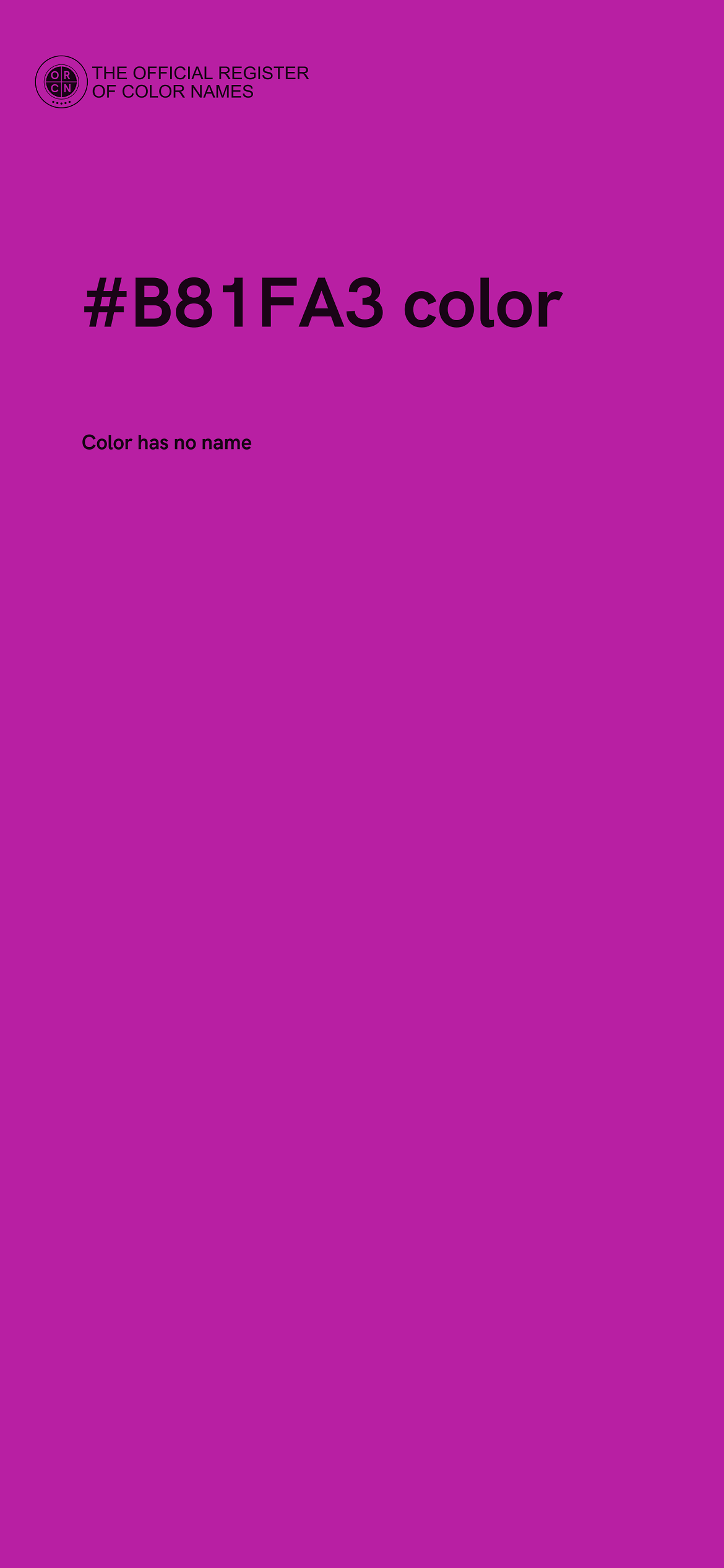 The digital color HEX #B81FA3 belongs to the Magenta Color Family featuring High Saturation (Saturation Family) and Light (Brightness Family).