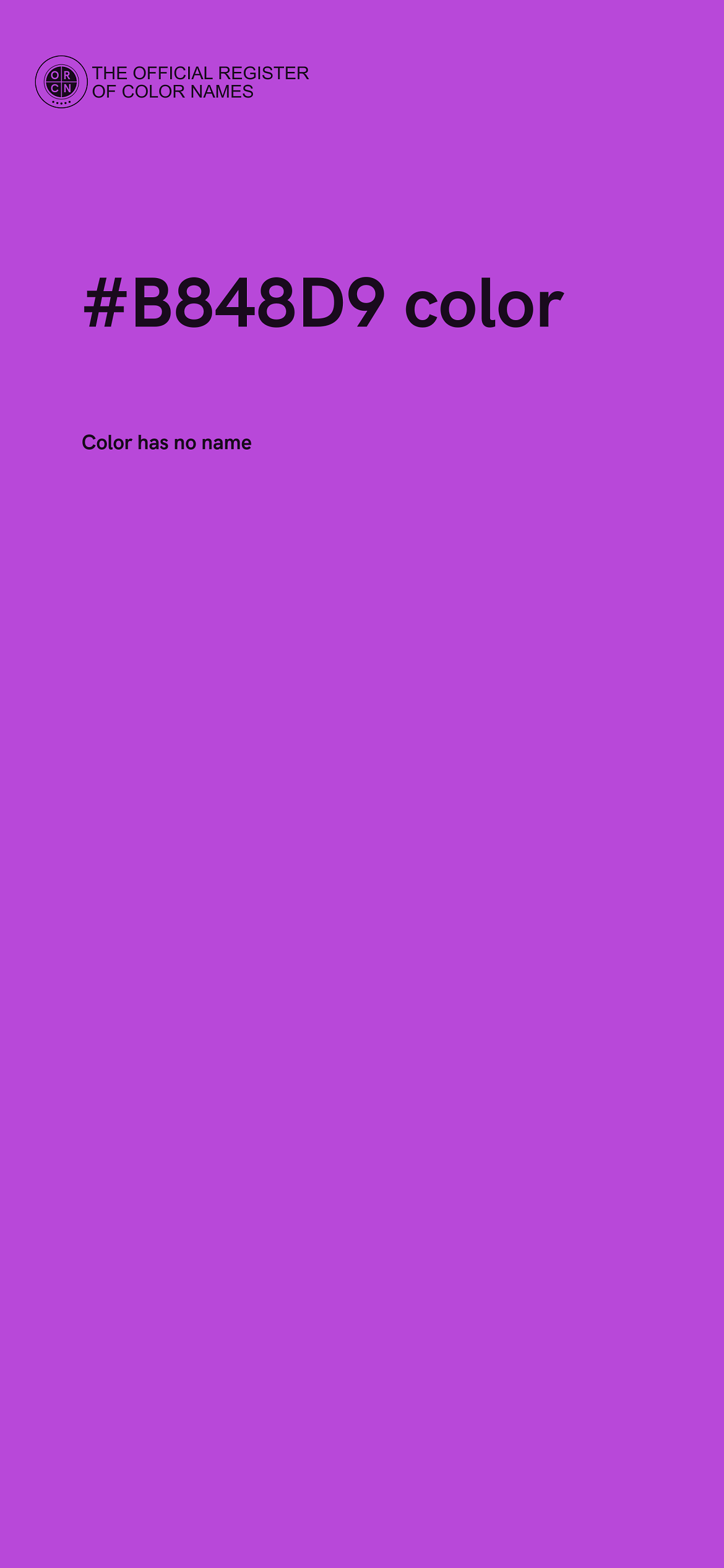 For printing in non digital world, #B848D9 is represented in CMYK as 13 Cyan, 57 Magenta, 0 Yellow, and 15 Black (Key) (C:13 M:57 Y:0 K:15).