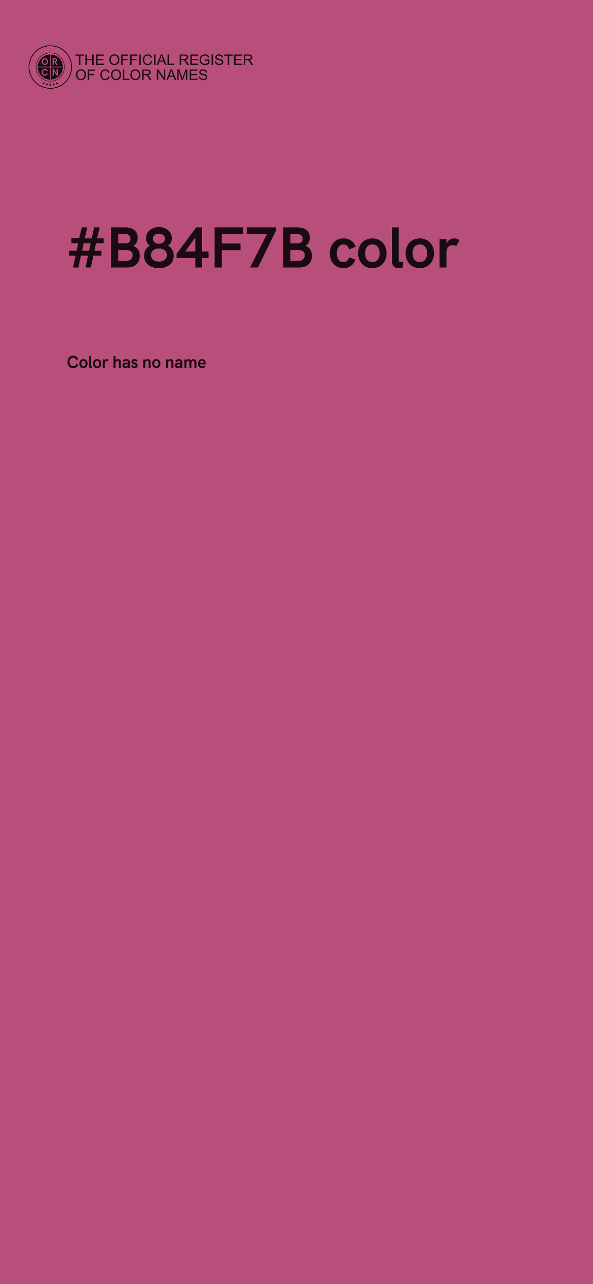 The digital color HEX #B84F7B belongs to the Rose Color Family featuring Moderate Saturation (Saturation Family) and Light (Brightness Family).
