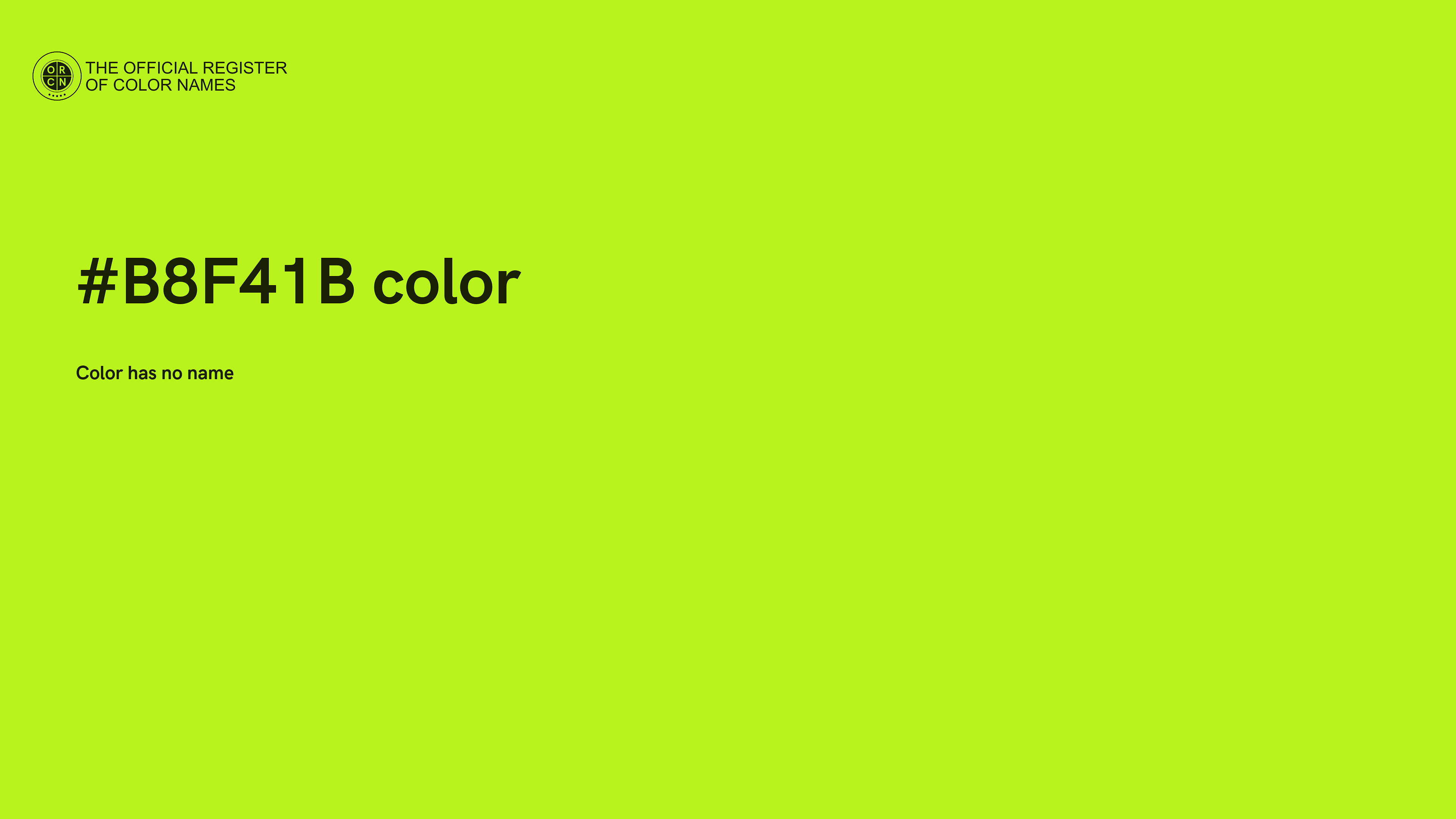 The digital color HEX #B8F41B belongs to the Chartreuse Color Family featuring Full Saturation (Saturation Family) and Light (Brightness Family).