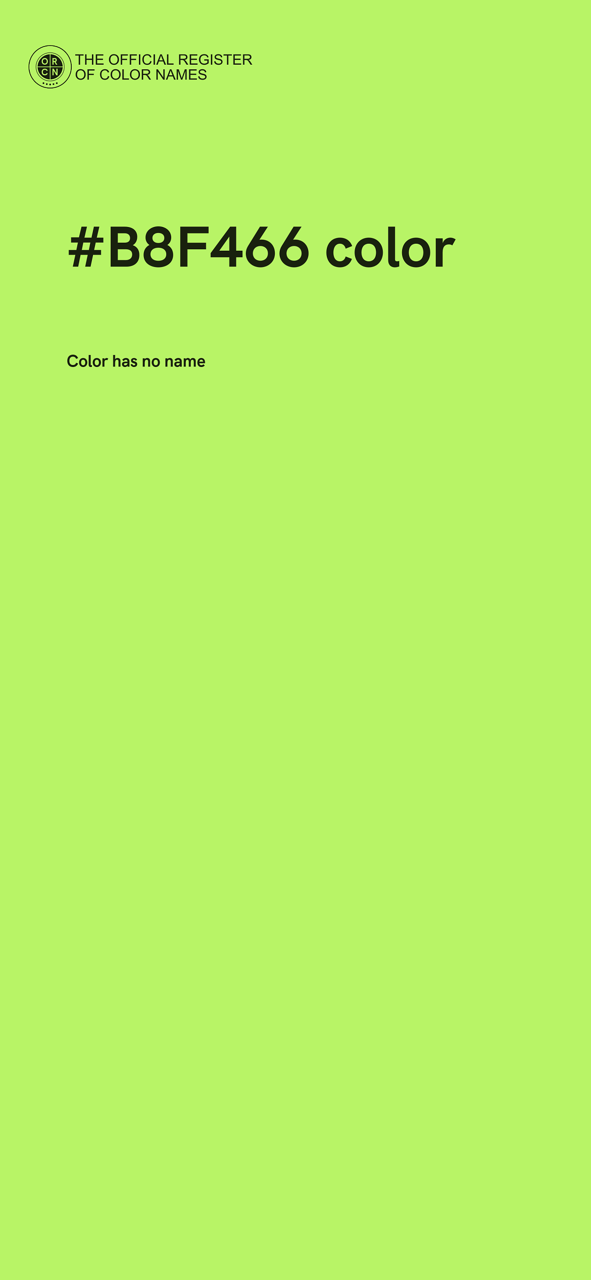 The digital color HEX #B8F466 belongs to the Chartreuse Color Family featuring Full Saturation (Saturation Family) and Very Light (Brightness Family).