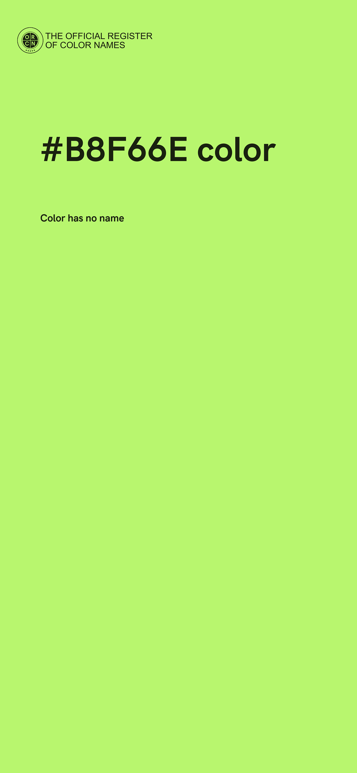 The digital color HEX #B8F66E belongs to the Chartreuse Color Family featuring Full Saturation (Saturation Family) and Very Light (Brightness Family).