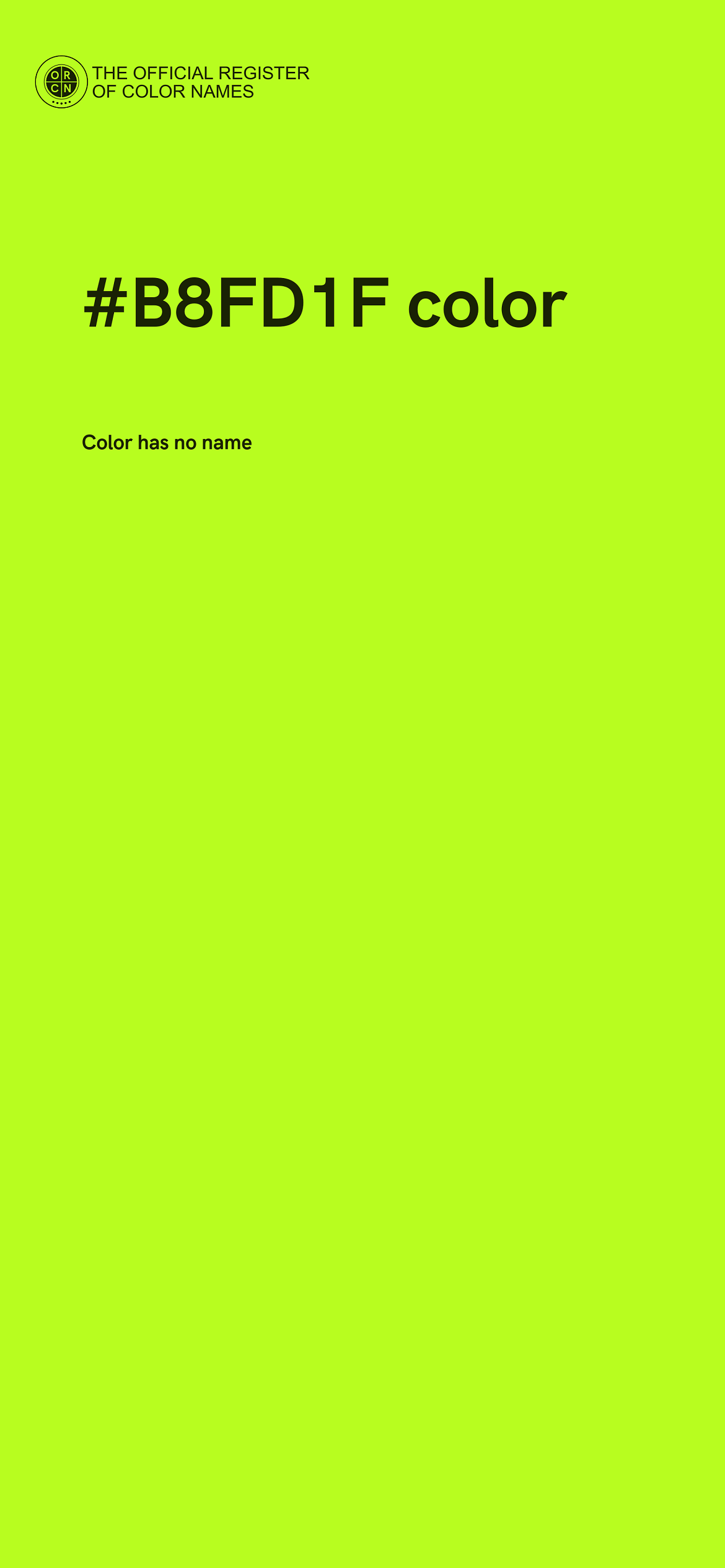 The digital color HEX #B8FD1F belongs to the Chartreuse Color Family featuring Full Saturation (Saturation Family) and Light (Brightness Family).