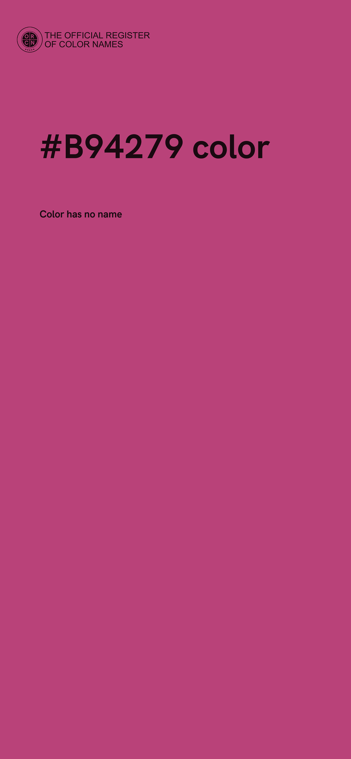 The digital color HEX #B94279 belongs to the Rose Color Family featuring Moderate Saturation (Saturation Family) and Light (Brightness Family).