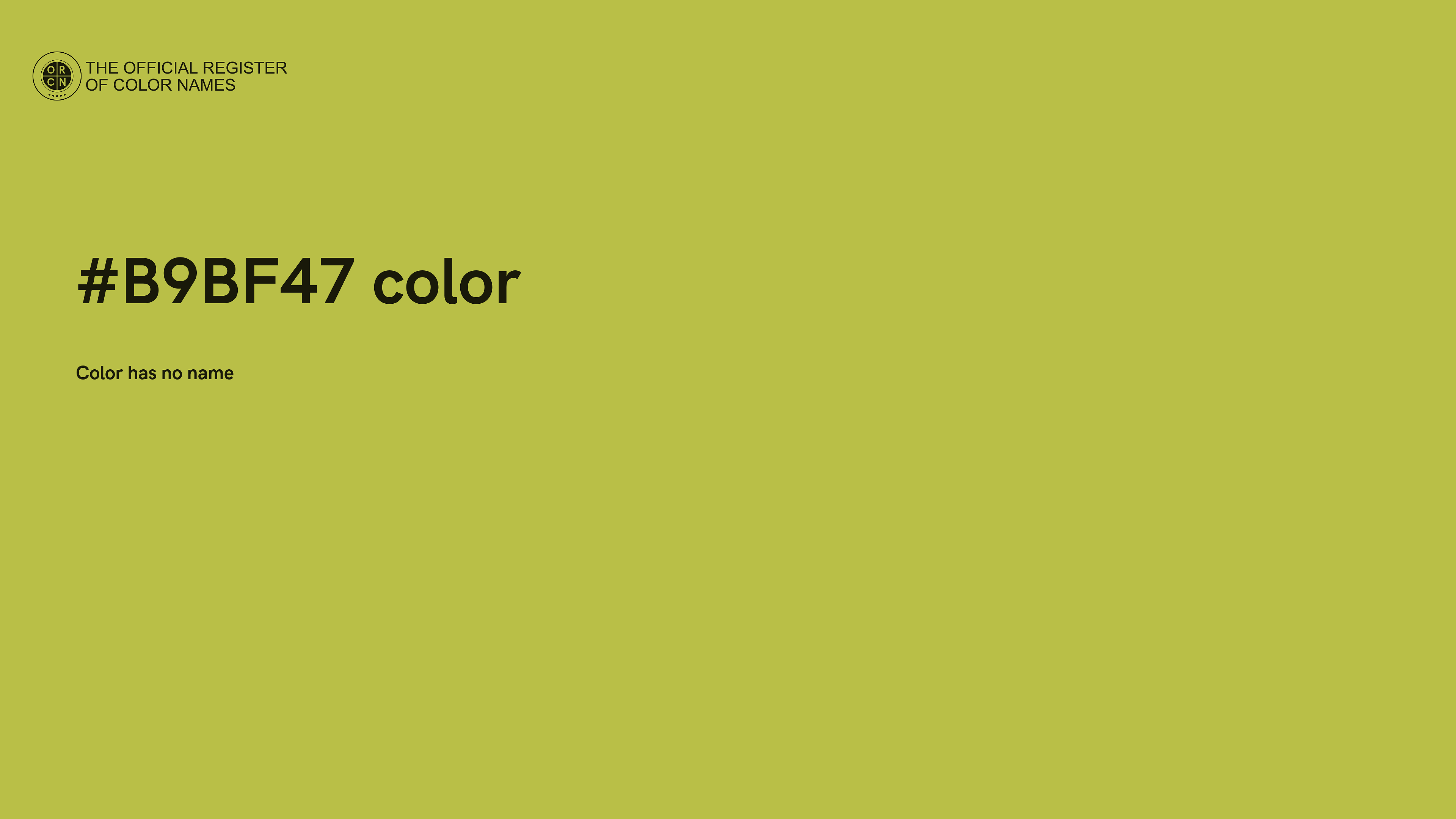 The digital color HEX #B9BF47 belongs to the Yellow Color Family featuring Moderate Saturation (Saturation Family) and Light (Brightness Family).